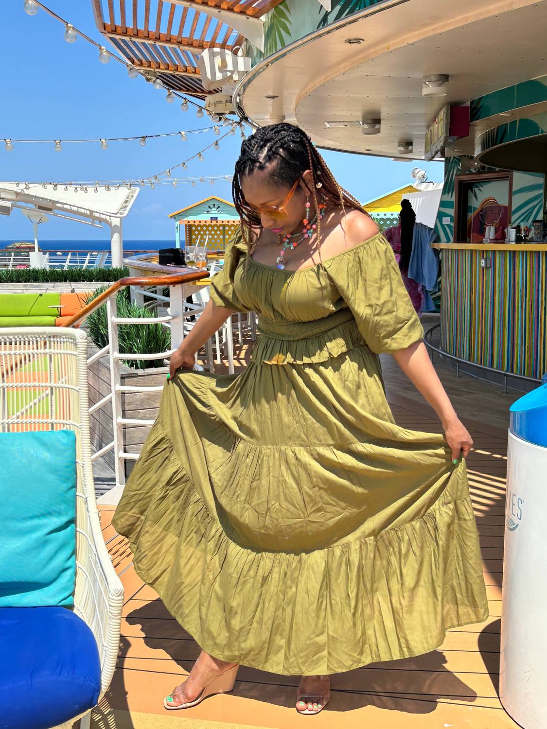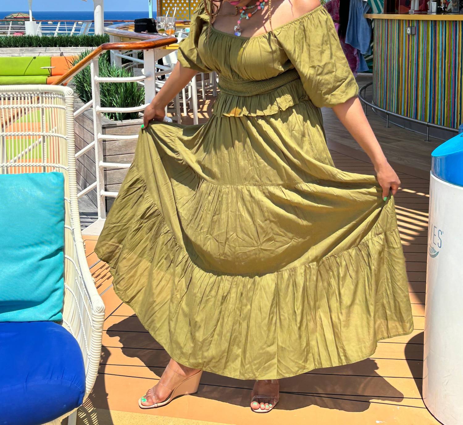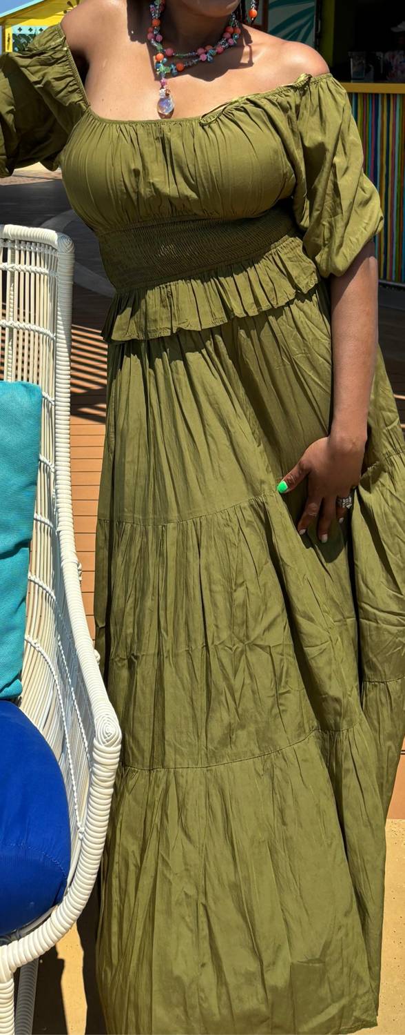 A maxi dress that is just as cute as it is comfortable. Introducing the Dirty Martini Olive Maxi Dress by ELAN, a sophisticated choice for both daytime events and early evening affairs. This elegant dress features an off-the-shoulder neckline with short sleeves, complemented by an A-line silhouette that offers fluid movement.