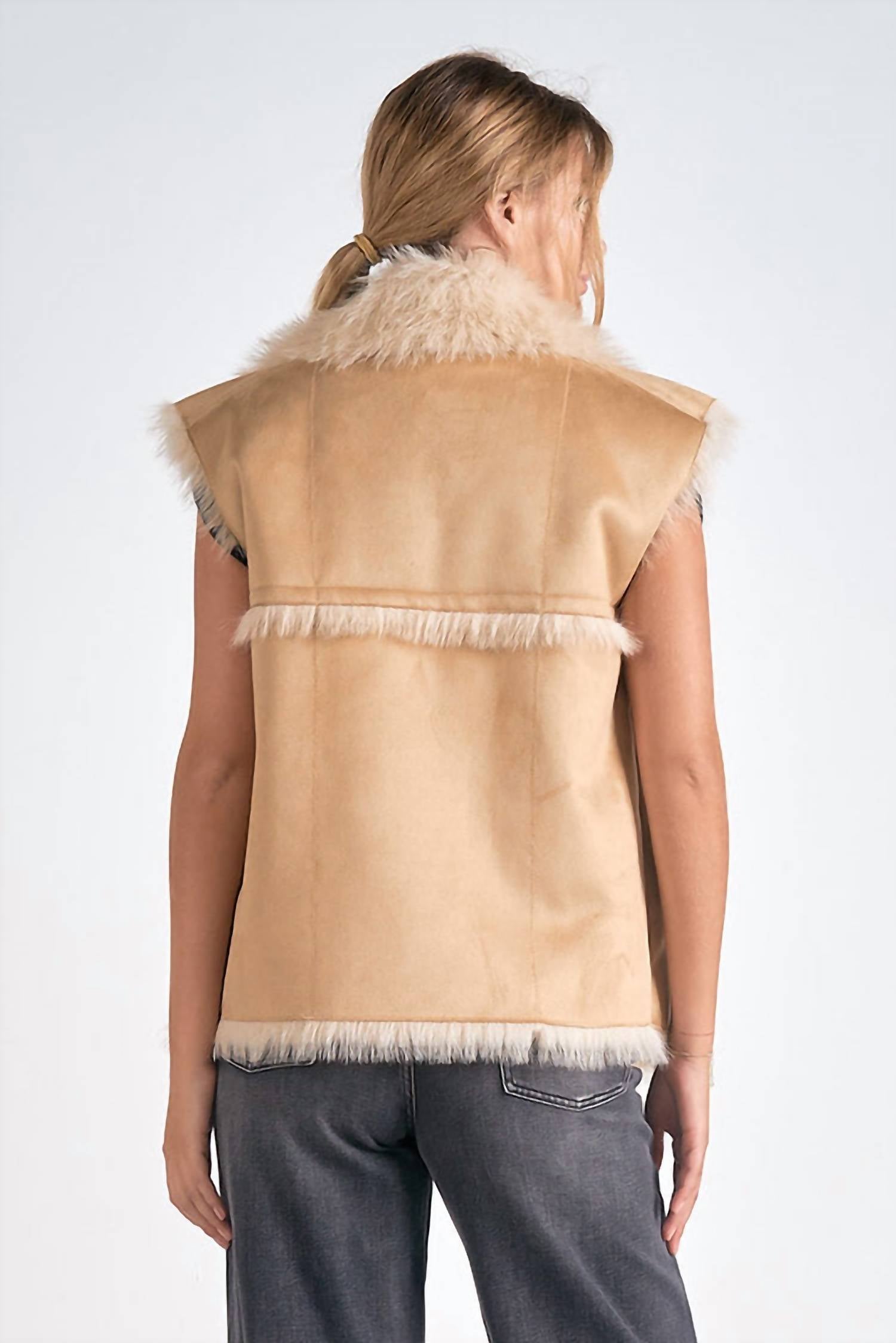 A vest so versatile you can mix and match it with almost any outfit and it will feel brand new every time. Experience the opulent charm of the Donna Fur Vest by ELAN in an elegant tan hue. This sleeveless vest, crafted from 100% polyester, exudes a textured appearance with a suede-like finish and a striking jumbo collar. The pull-on style is perfect for effortless travel fashion, making it a fall essential. Designed for women, it features a lined interior with care instructions suggesting hand wash and lay flat to dry.