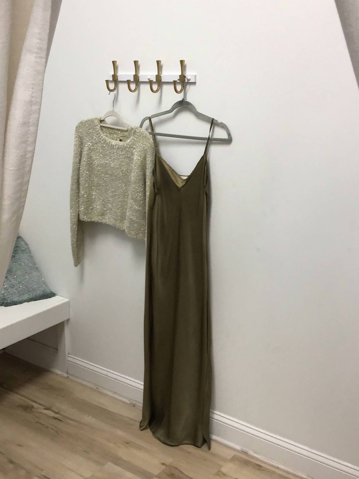Style this maxi with your favorite statement necklace and sandals for the perfect look. Gold adjustable straps dress with gold eyelash sweater on top