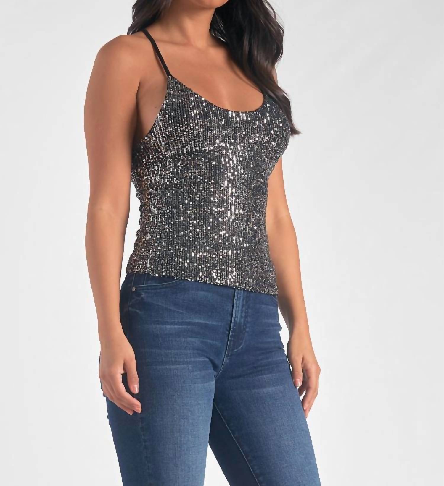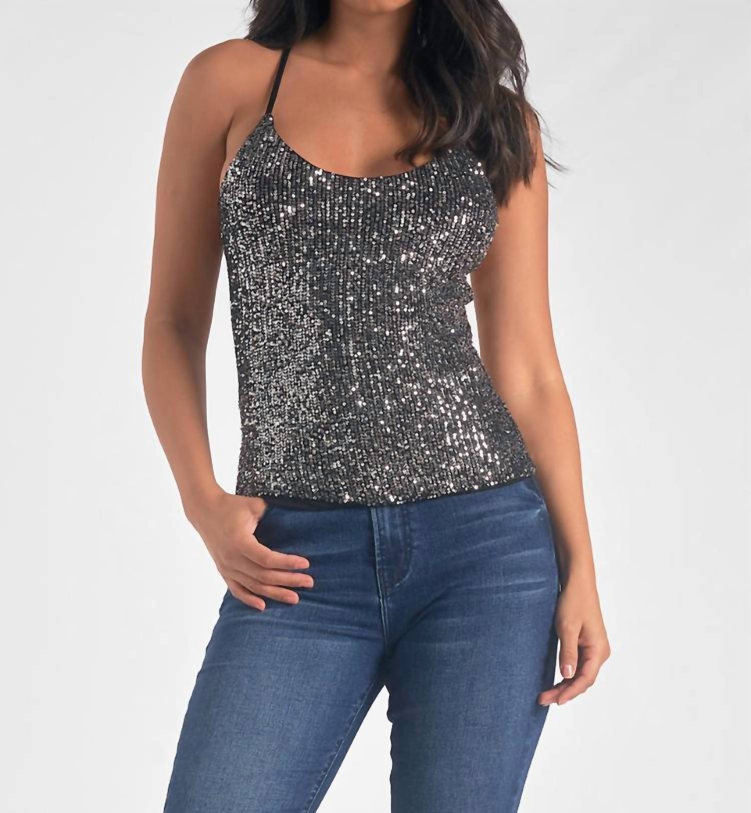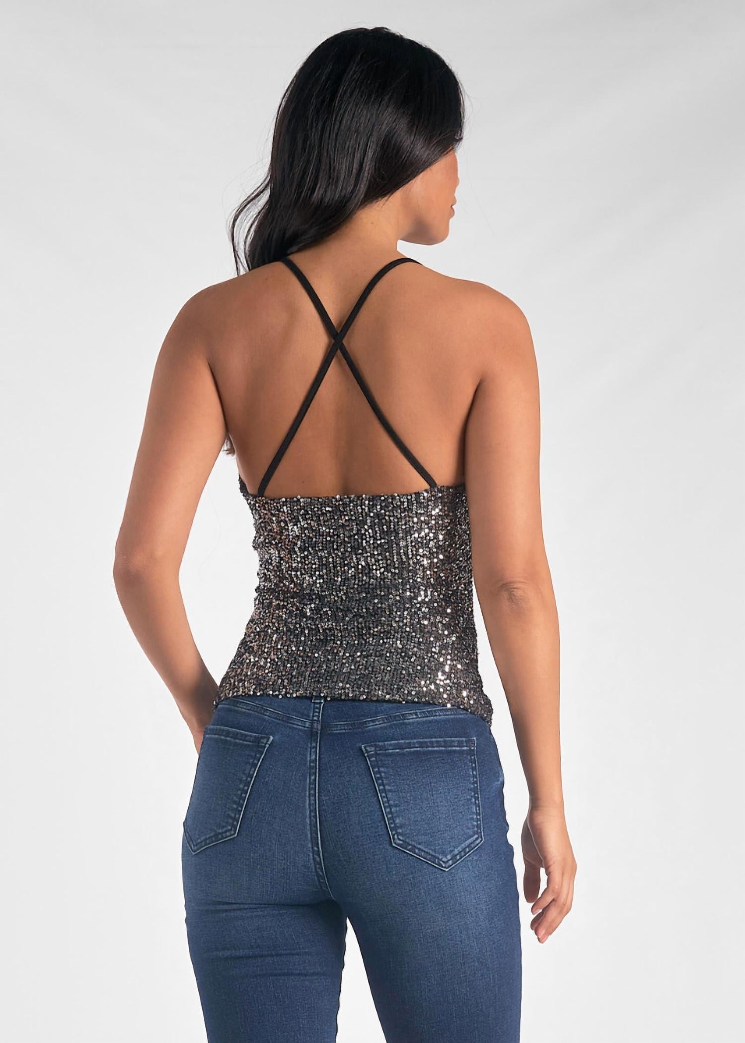 Throw this on with your favorite blazer for a more polished look. Sequin. Scoop neck. Fitted. Crisscross back.