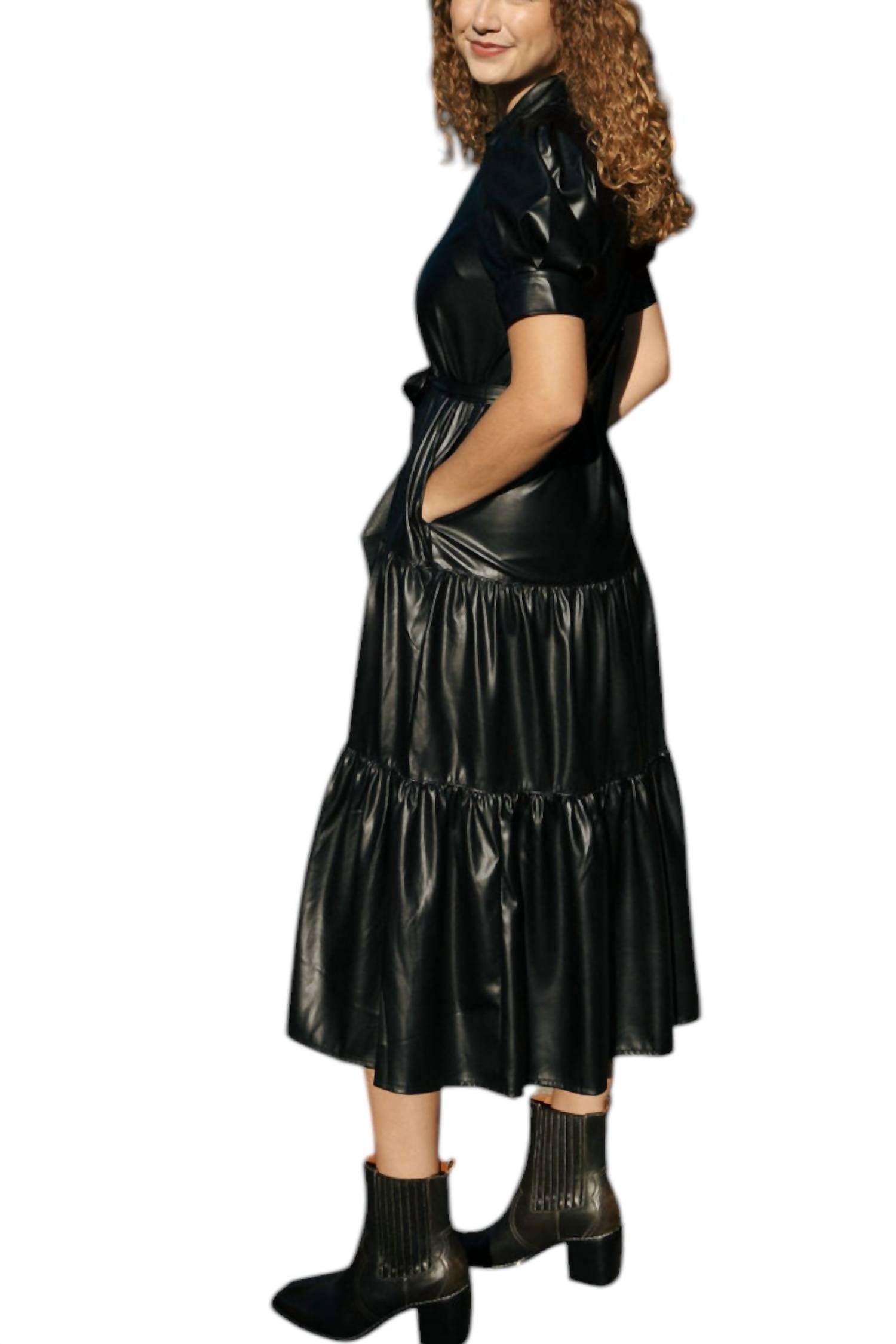 A midi dress so versatile, your options for wearing it are endless. Discover the sleek sophistication of the Faux Leather Tiered Dress by ELAN. This women's black A-line dress features stylish short sleeves and a chic V-neckline, crafted from premium faux leather. Designed with the modern woman in mind, it includes convenient pockets and a practical button closure. Embrace effortless elegance with this true-to-size, solid pattern midi dress, perfect for any occasion.