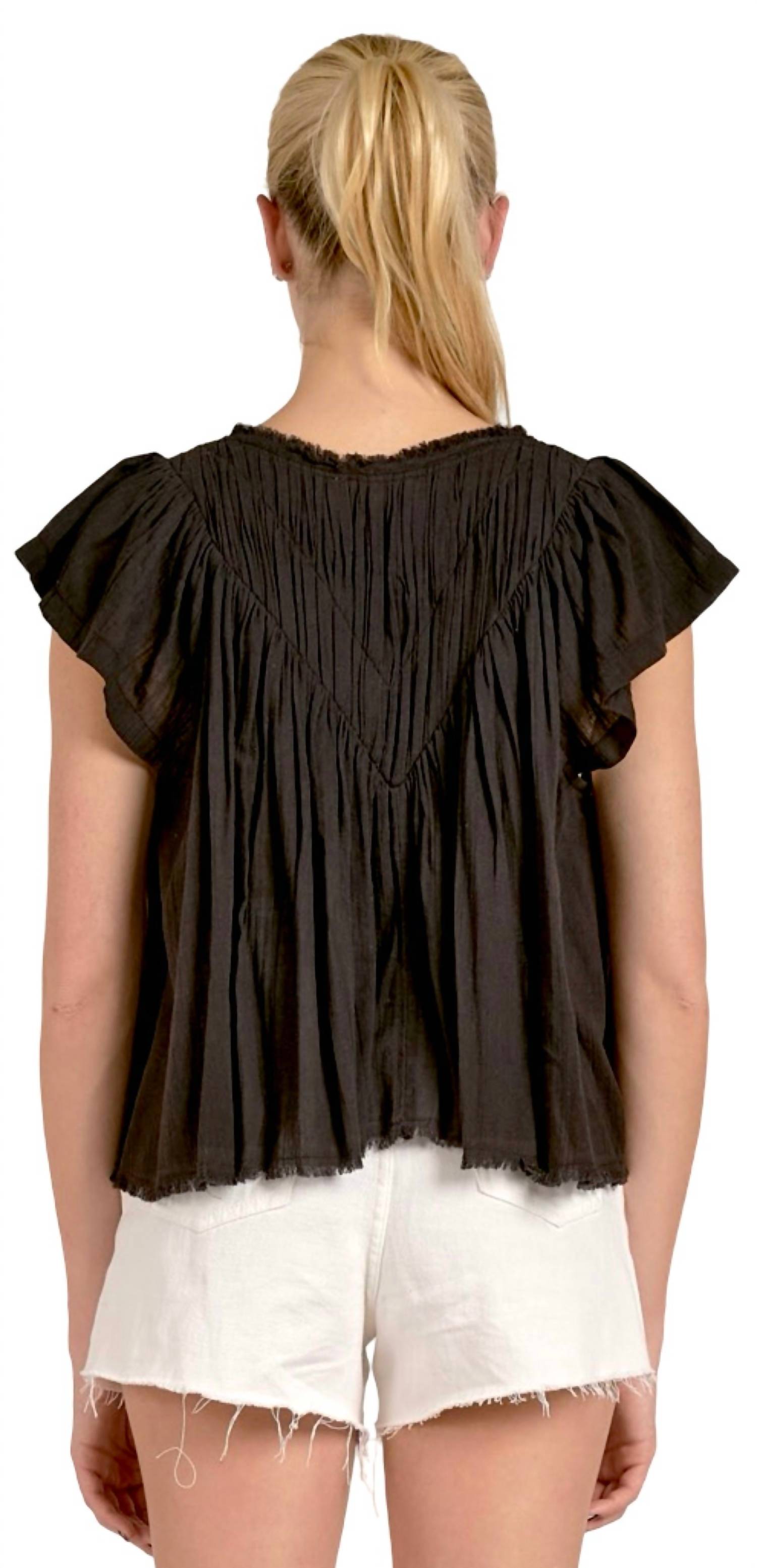 This classic, short sleeve tee will be your go-to staple this season and beyond. Introducing the Flutter Sleeve Shirt by ELAN, a chic addition to your wardrobe. This women's tee features short flutter sleeves in a solid black cotton voile, offering both style and comfort with its lined design. The pull-on closure and V-neckline make it effortlessly fashionable. Care for this top by hand washing to maintain its quality.
