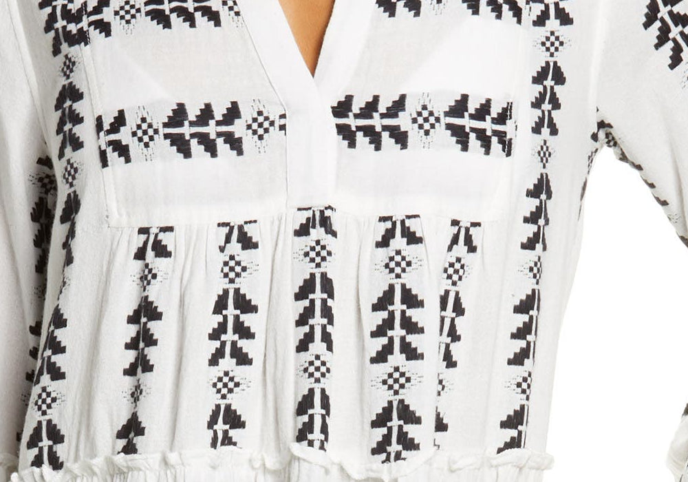 Grecian-inspired aesthetics | White/Black design | Lightweight cover-up | Versatile Size Small | Available at Nordstrom | Soothing material blend | Adjustable strap design | Flowy silhouette | Unique pattern design | Comfortable fit