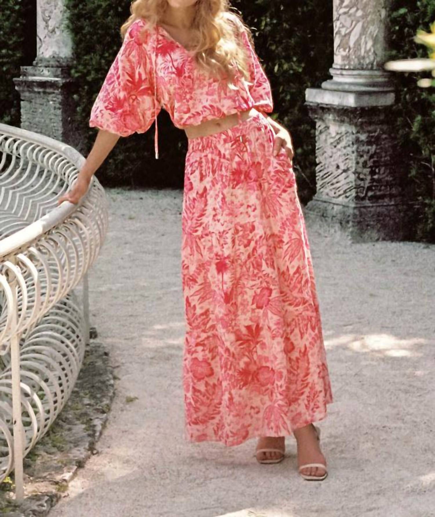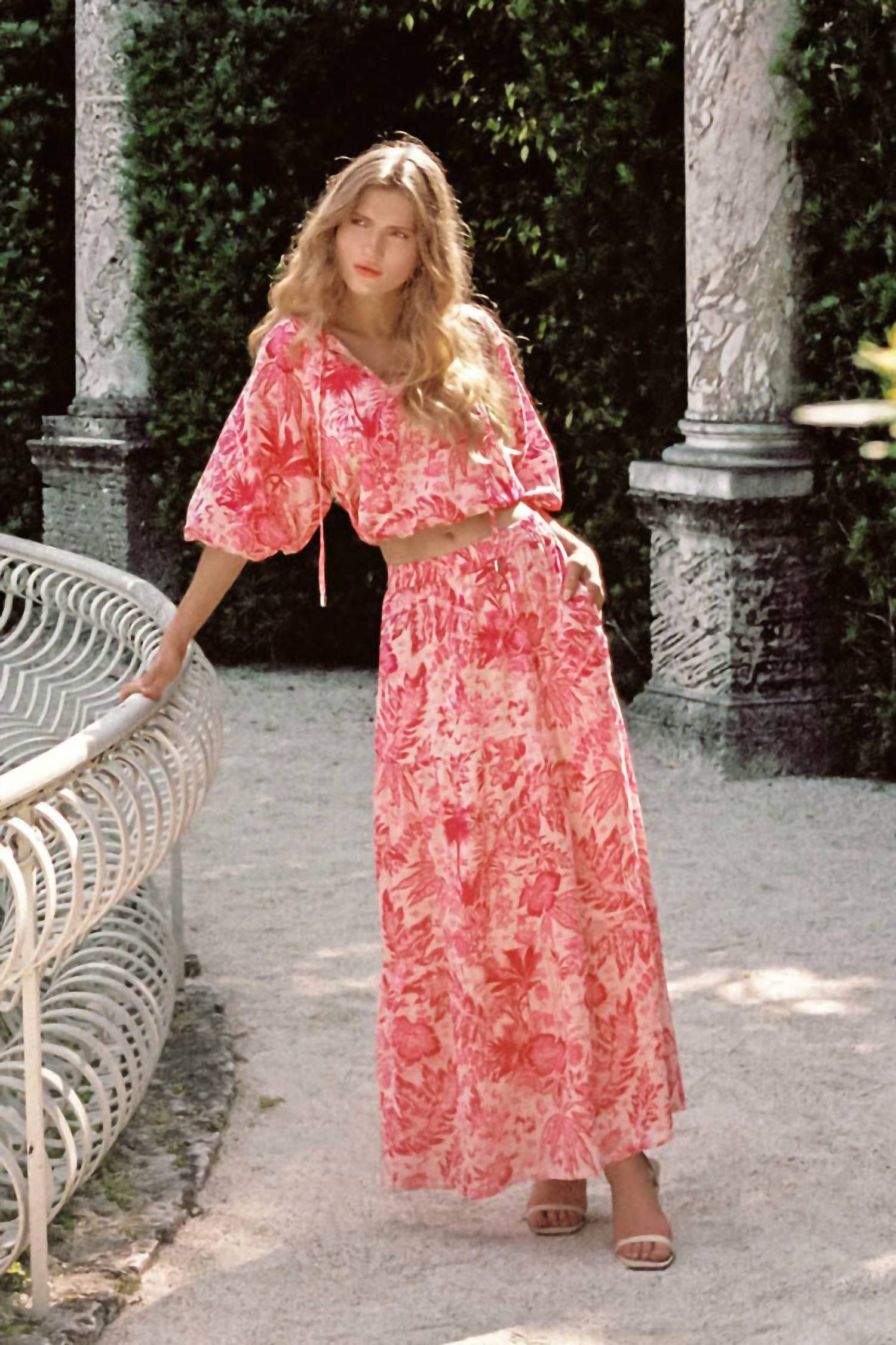 Who doesn't love a good maxi skirt? This tropical pink and peach tiered shirt is fully lined and absolutely adorable! Pair it up with a simple white top a jean jacket for an easy look.
