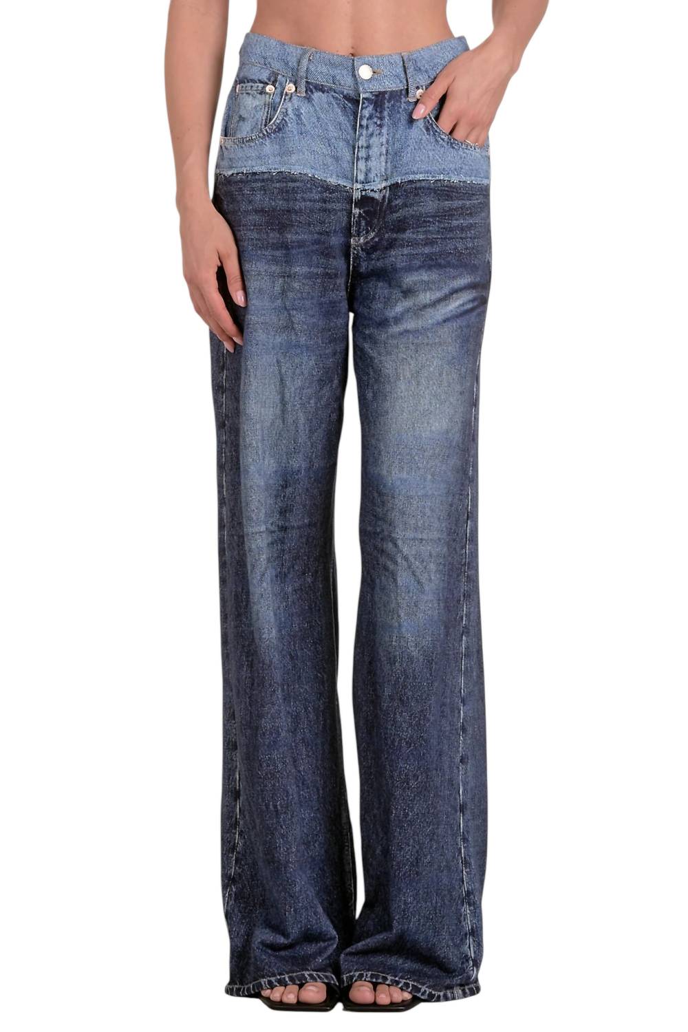 Discover the Jade Sweatpant Jean by ELAN, a stylish two-tone denim masterpiece for women. Made from 100% cotton, these high-rise jeans feature a relaxed straight leg fit with a solid pattern and come equipped with pockets. The button closure ensures a secure fit, while the medium wash beautifully complements its grunge trend appeal. Easy to care for, simply machine wash and tumble dry. Model, height 5’10”, wears a size small with waist 27 inches and inseam 30 inches for the perfect look at a dinner party or 4th of July celebration.