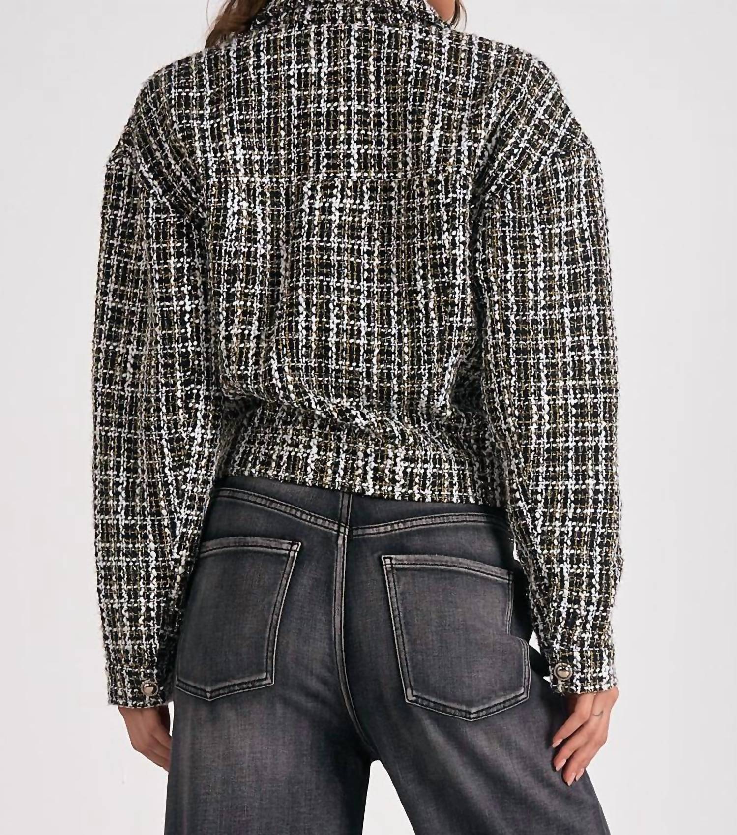 Tailored to perfection, this blazer will be your go-to jacket for years to come. Elevate your wardrobe with the Jazz Tweed Jacket Blazer by ELAN, a chic and versatile piece in a striking black with gold and white metallic plaid design. This long-sleeve blazer is crafted entirely from 100% polyester and features a sophisticated button closure. Ideal for adding a touch of shine to any ensemble, it also includes pockets for functionality. Care for this fashionable statement piece with hand washing to maintain its elegant texture. Model is 5'9", with measurements of 34" bust, 24" waist, and 36" hips, and is wearing a size small.