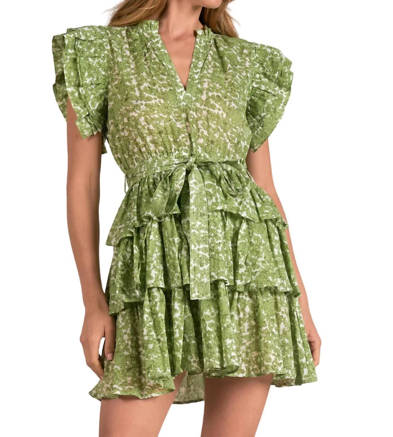 The kind of easy and flattering dress you'll be reaching for all season long. Introducing the Julianna Mini Dress by ELAN, a charming addition to your wardrobe in the refreshing Green Santa Fe floral pattern. This playful piece features cap sleeves and a split V-neckline, enhanced by ruffles and a tiered A-line skirt. Expertly crafted from 100% cotton, the dress offers a comfortable pull-on closure and an elastic waist accentuated with a matching belt for a flattering silhouette.