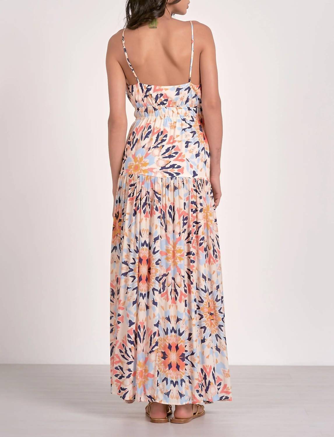 A maxi dress that is just as cute as it is comfortable. Step into the spotlight showcases of color in a mesmerizing kaleidoscope pattern. Maxi dress is designed with spaghetti straps and a low cut V-neck featuring three ties with beads, while a fitted band beneath the bust highlights your silhouette. Made from 100% viscose with a cotton lining, offers a luxurious feel, perfect for summer beach days. Pull-on closure. Hand wash cold, line dry, do not bleach, cool iron if needed.