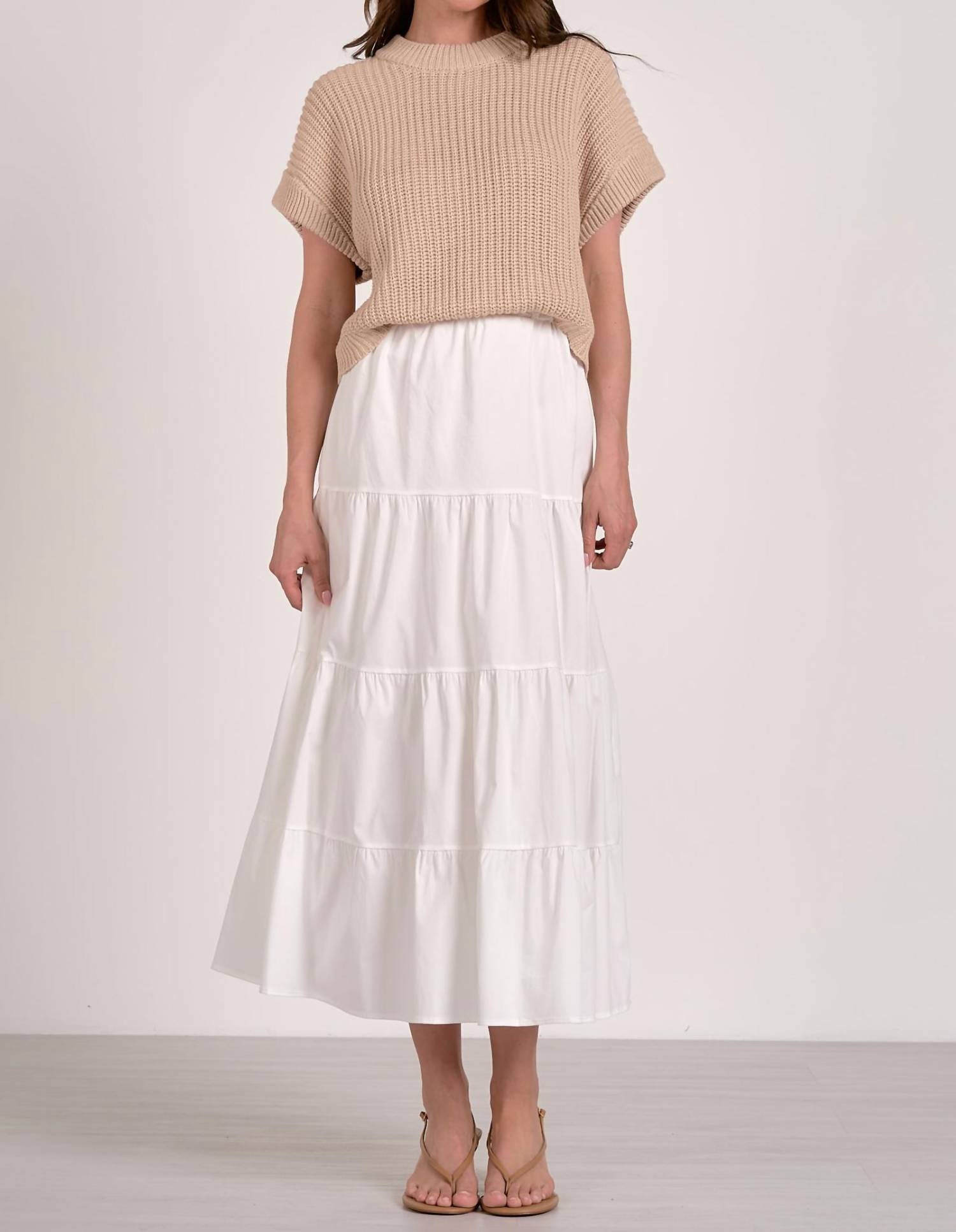 A midi dress so versatile, your options for wearing it are endless. Elevate your wardrobe with the Kari Sweater Dress by ELAN, a chic blend of comfort and style in Beige/White. This women's midi dress features short sleeves and a crewneck, designed with a textured cotton knit that exudes modern elegance. The A-line silhouette offers a relaxed fit with a flowy tiered skirt, perfect for casual outings. Easy to wear with its pull-on closure, this piece effortlessly combines contrasting textures for a unique look.