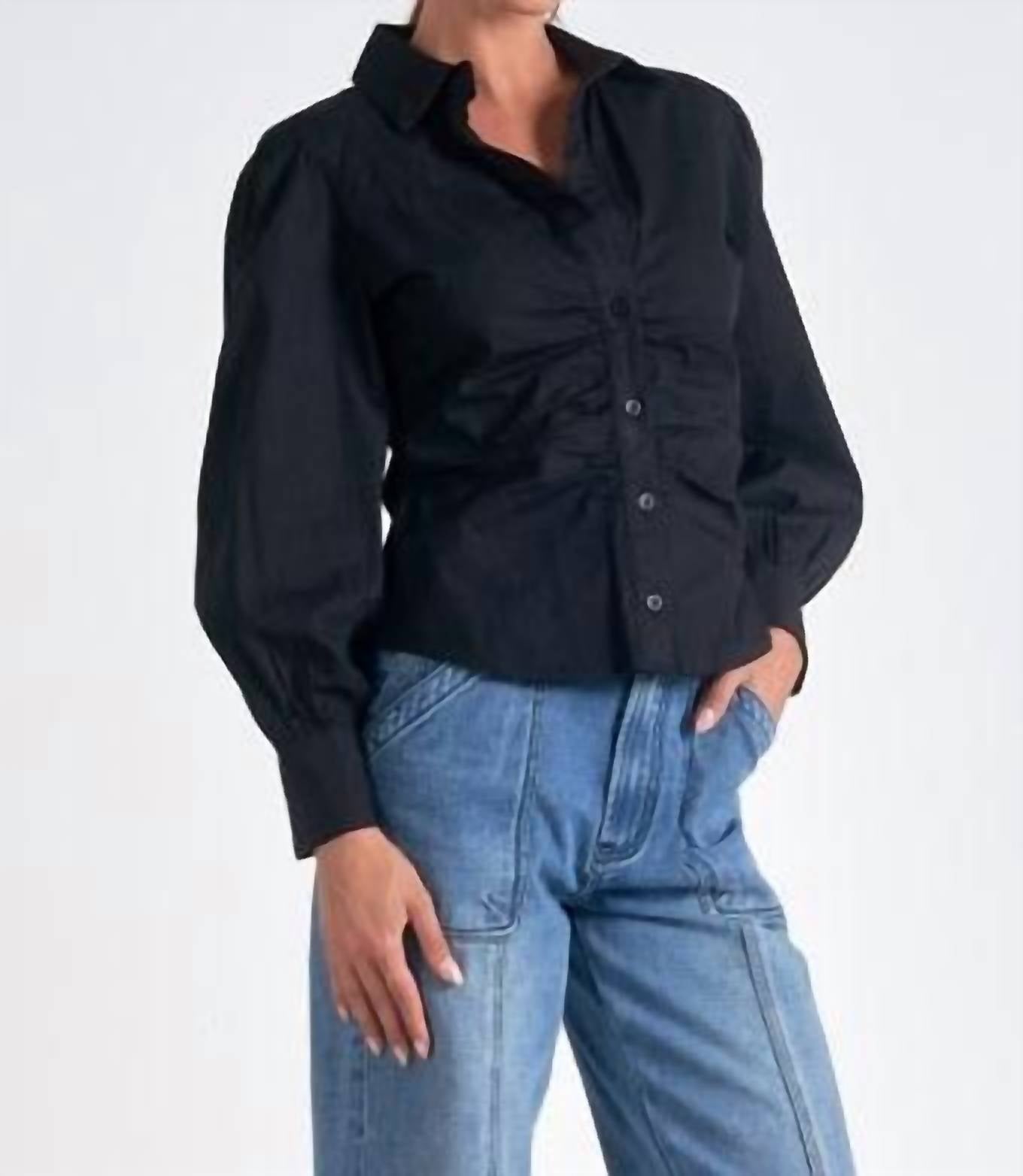 Perfectly tailored and soft to the touch. Discover the Kati Top by ELAN, a sophisticated long sleeve button-down ruched blouse that epitomizes chic elegance in solid black. This women's shirt features a classic collared neckline, enhancing its timeless appeal. Closure: Button closure. Perfect for dressing up or down to suit any occasion.