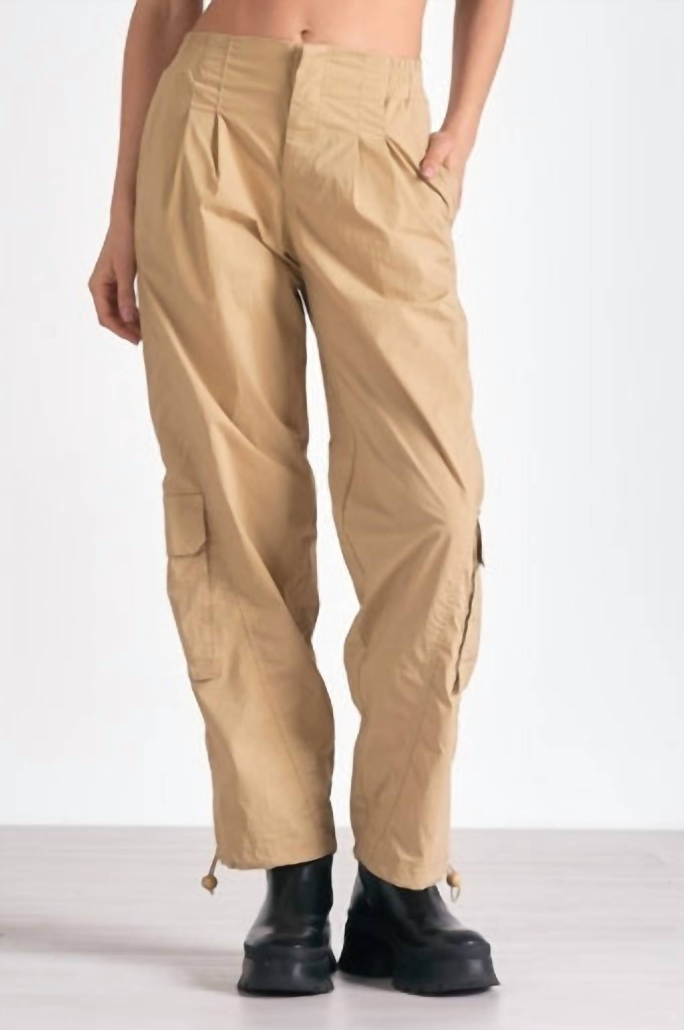 Step up your streetwear game with a utility-chic staple in classic tan. Cargo-style trousers flaunt a solid pattern and a straight leg design, enriched with large pockets and a laid-back parachute silhouette. Composed of 53% Cotton, 42% Nylon, and 5% Spandex. Offer durability and flexibility, complemented by adjustable ankle drawstrings for tailored styling. Feature a high-rise waist and a secure hook and eye closure.