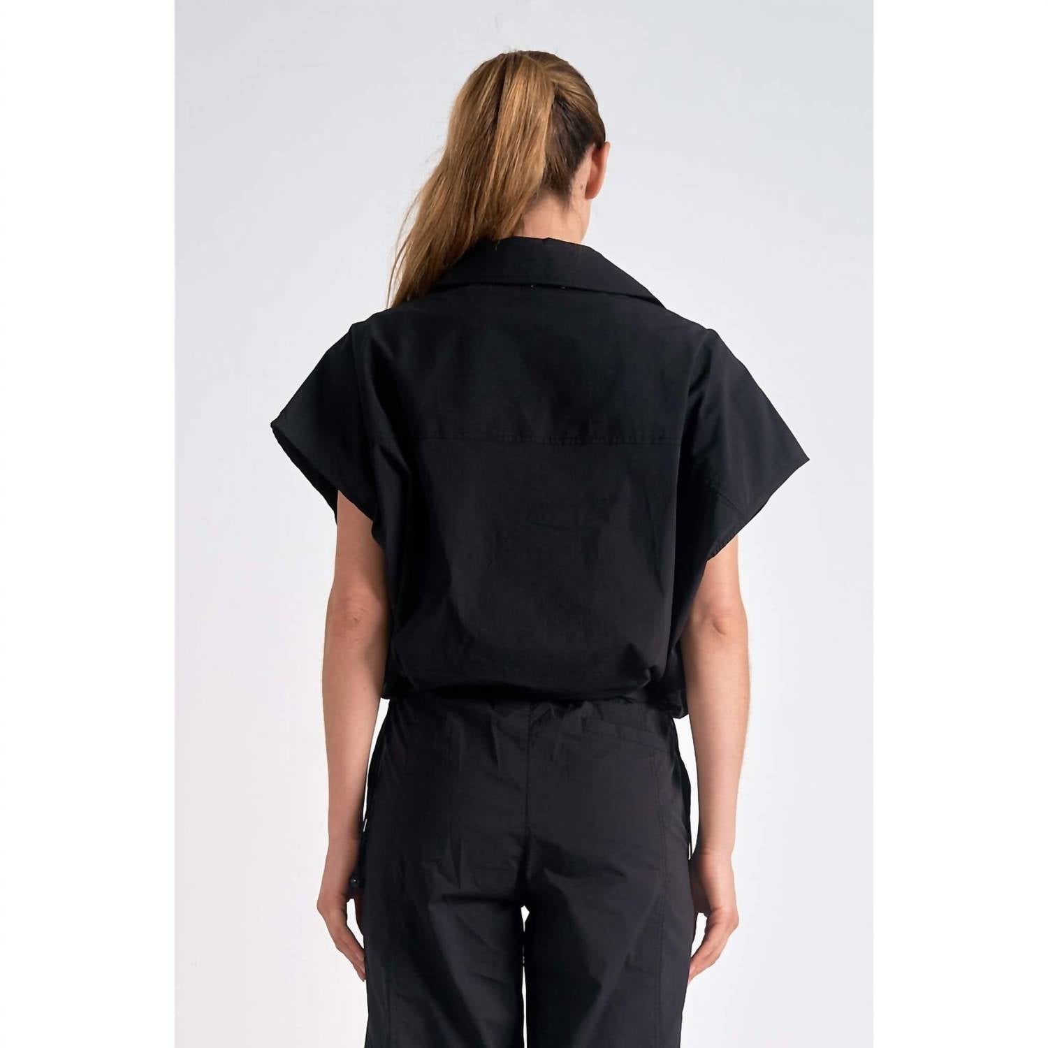 A versatile blouse that works from desk to dinner! Embrace effortless chic with the Last Spot Blouse by ELAN, a solid black piece perfect for any occasion. Featuring short sleeves and a convenient front pocket, this blouse offers both style and functionality. Closure: Snap closure. With a classic collar neckline, it's a sophisticated addition to any wardrobe.