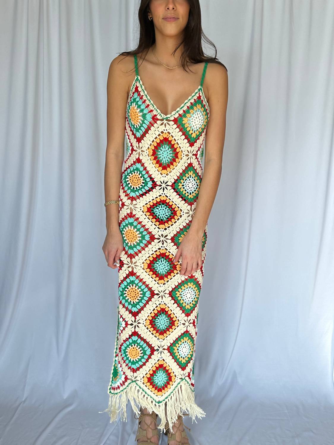 A maxi dress that is just as cute as it is comfortable. Discover effortless vacation style with the ELAN Lela Knitted Fringe Dress, featuring playful spaghetti straps and a chic V-neckline. This maxi bodycon dress showcases a vibrant multi-colored pattern, beautifully complemented by fringe detailing at the bottom. Crafted from soft acrylic, it offers a pull-on closure for easy wear. Care: Hand wash cold and lay flat to dry.