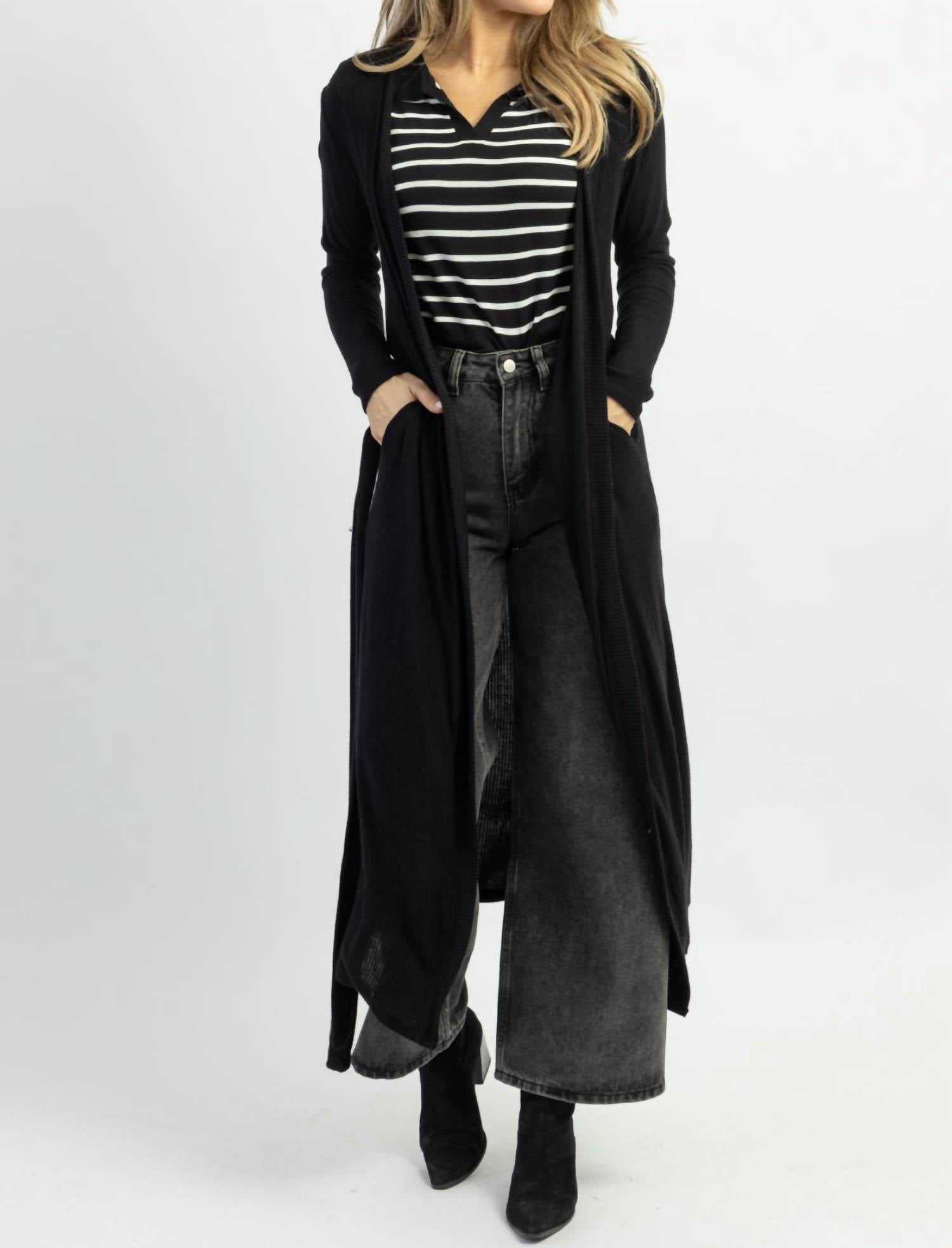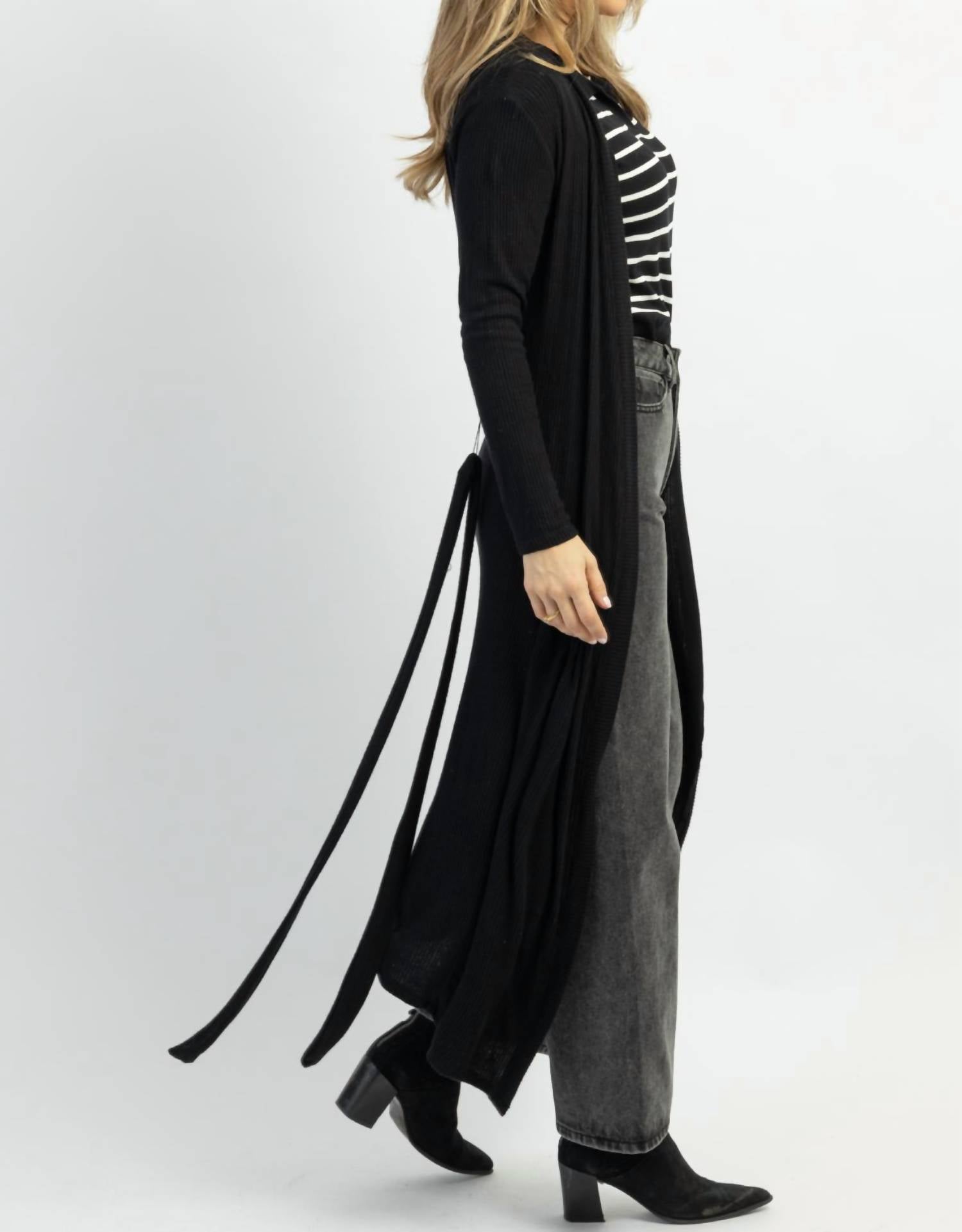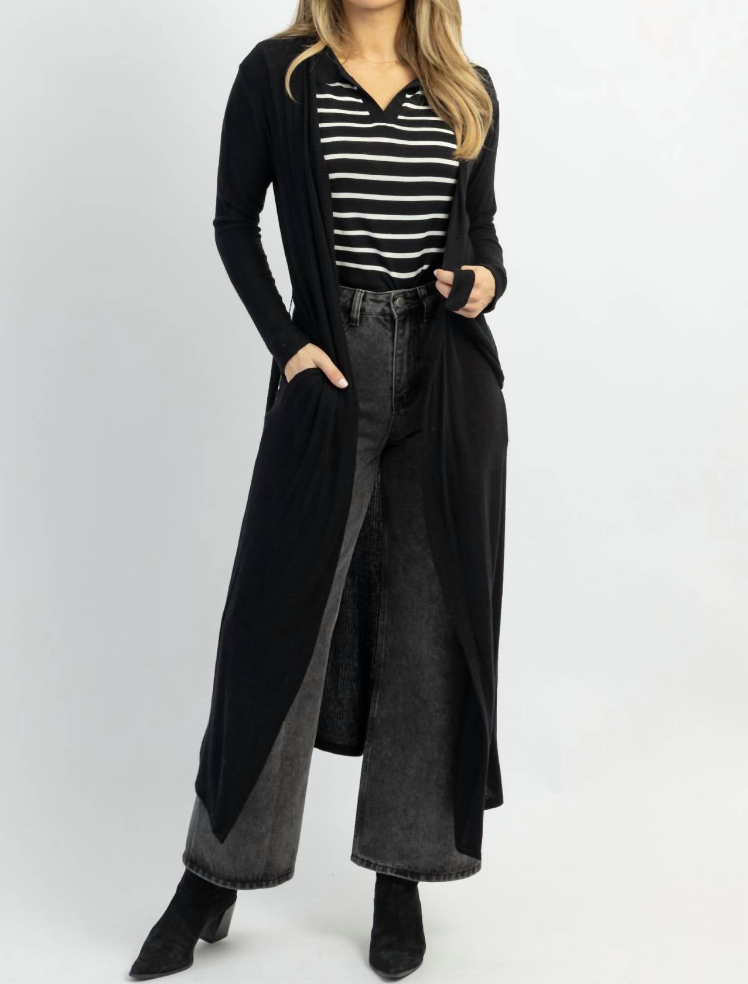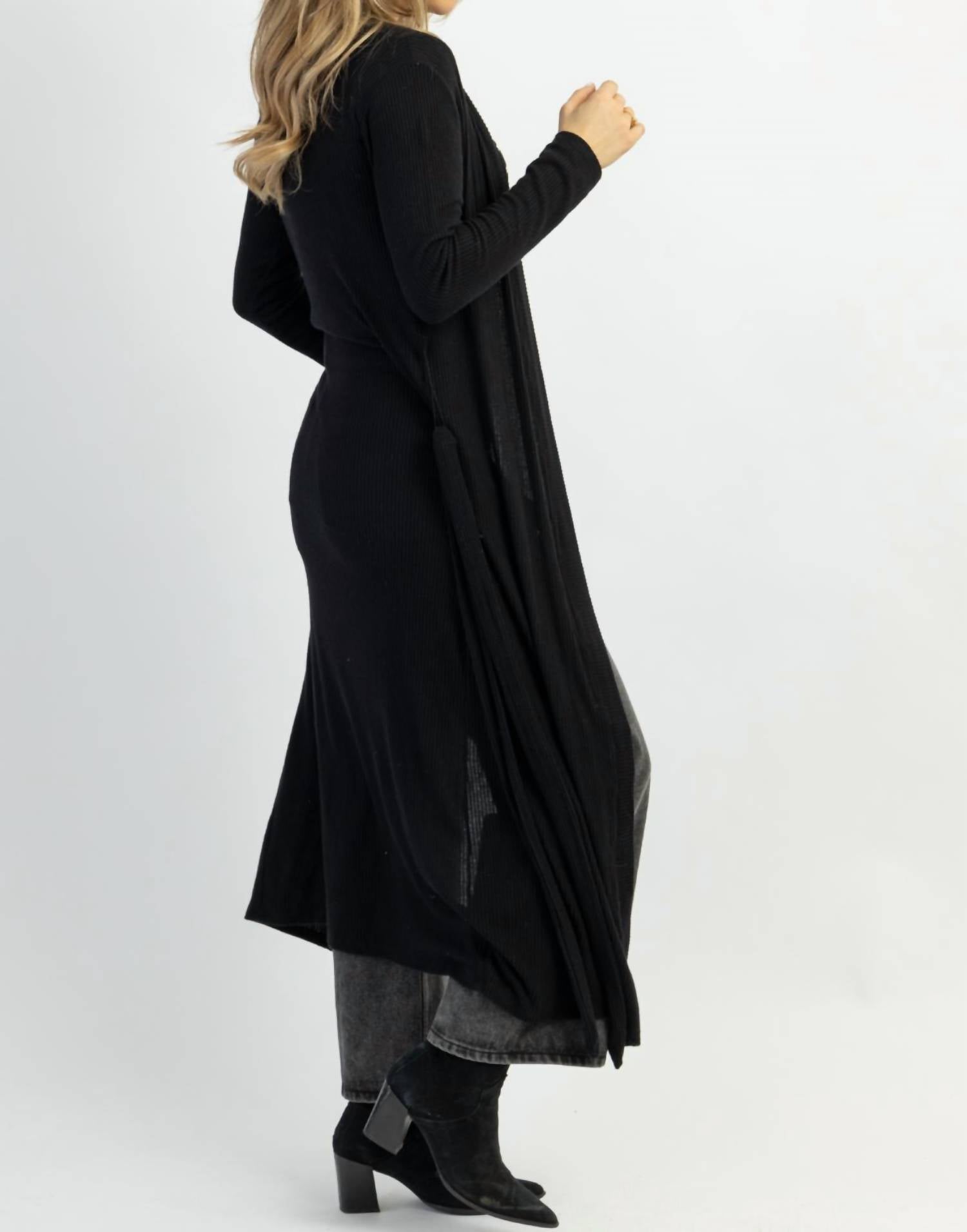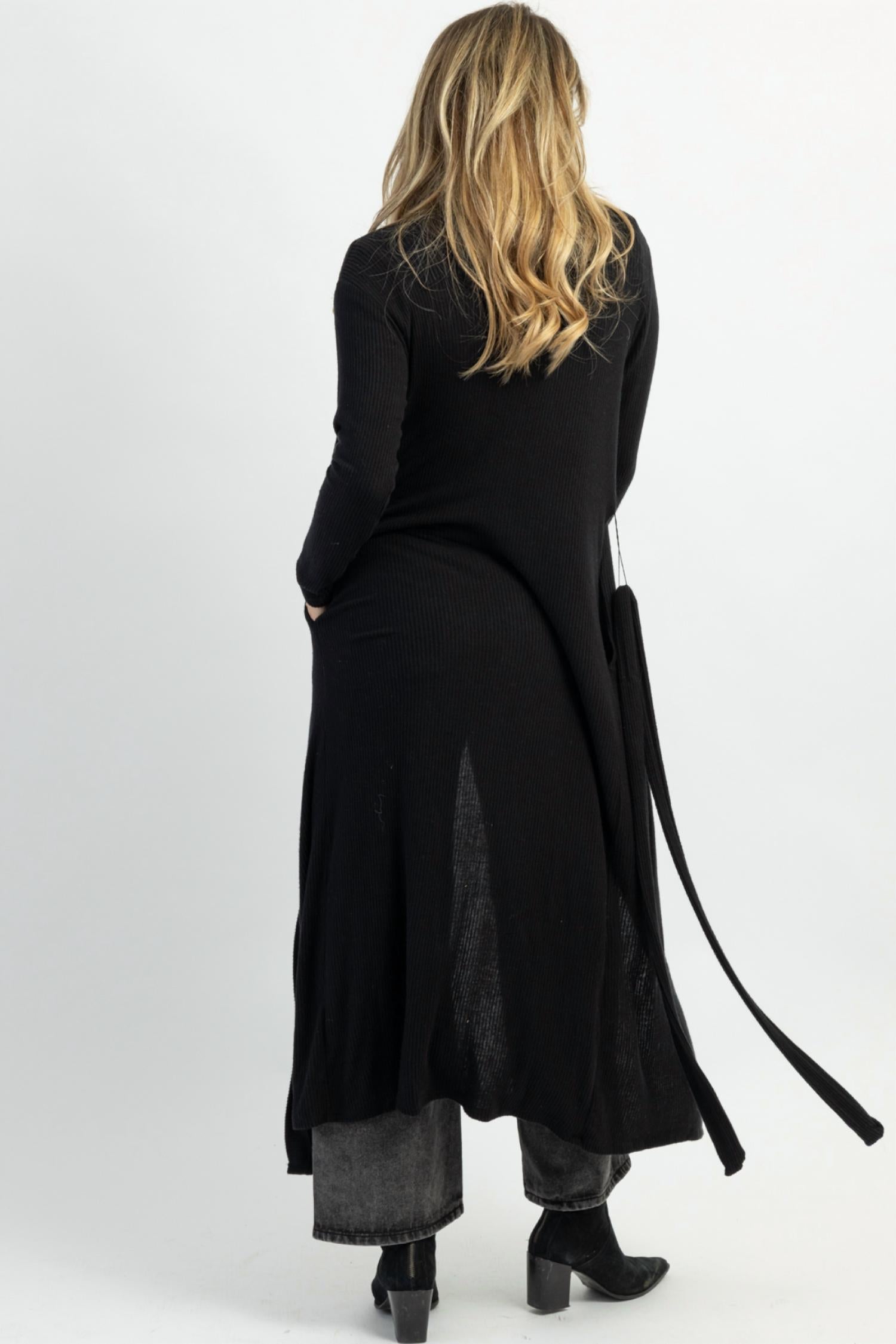 This cardigan will be a sweater-rotation favorite. Long sleeves, ribbed, long midi-maxi length, self-tie waist, lightweight for layering. 100% cotton. The model height is 5'8, and the dress is size 2.