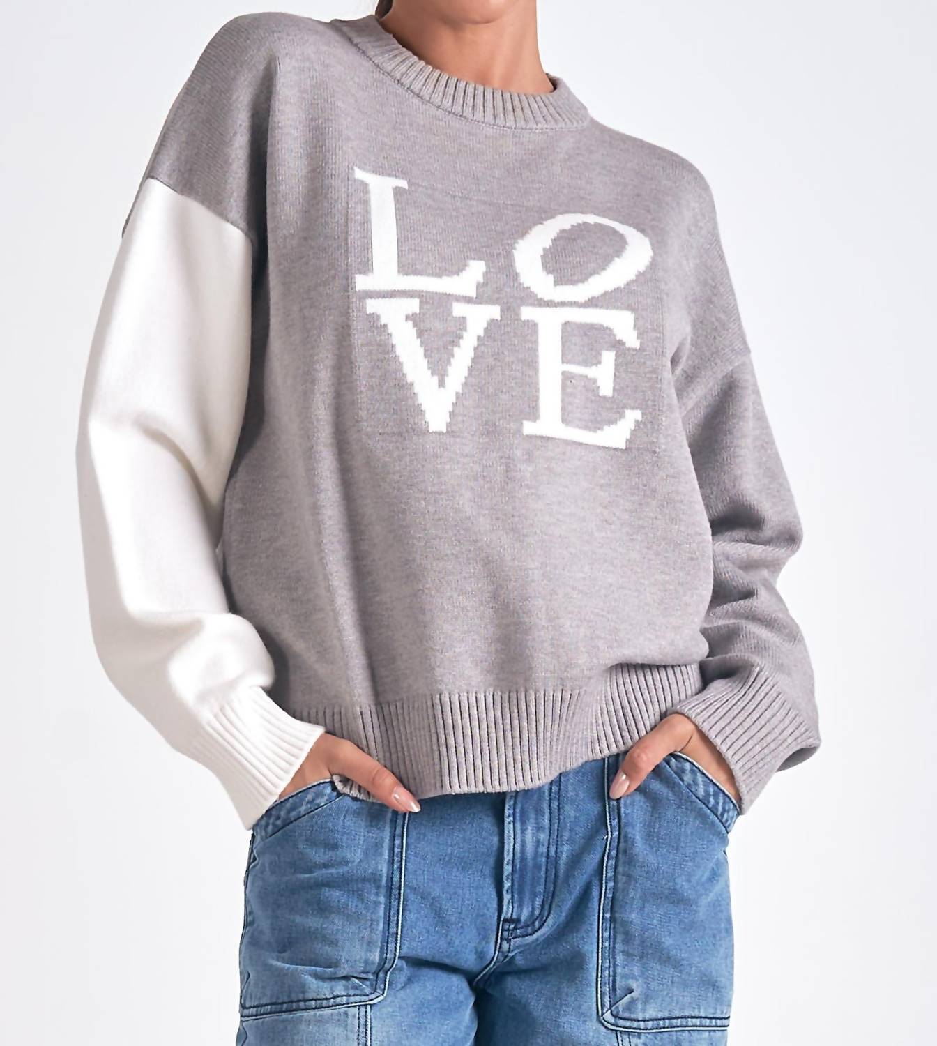 Elevate your fall collection with the "Love" Color Block Sweater by ELAN, an ideal choice for a cheerful back-to-school ensemble. This long sleeve, graphic pattern sweater features a charming crewneck and showcases a playful color block design with the word "love" artfully knit in a stylish gray hue. Crafted in a comfortable viscose blend, this pullover is perfect for streetwear trends, offering machine wash care for your convenience. Effortlessly brighten any outfit and capture the joy of Thanksgiving festivities with this chic and cozy piece.