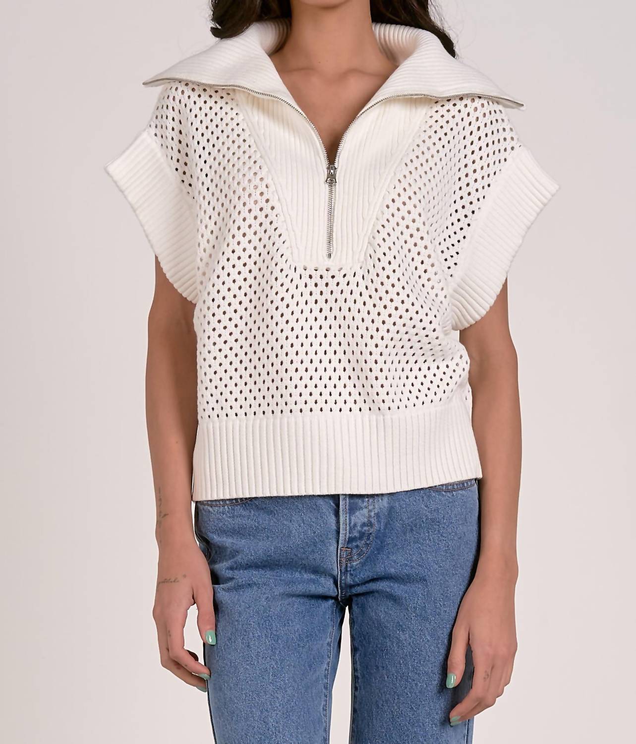 You'll be reaching for this comfy and classic v-neck sweater all season long. Elevate your wardrobe with the Women's Luna Quarter Zip Sweater by ELAN, a perfect blend of style and comfort in crisp white. Featuring short sleeves and crafted entirely from 100% cotton, this V-neck sweater showcases a stylish large collar and open knit details for a breezy feel. The flowy, boxy fit and textured pattern make it an easy choice for both casual and chic looks. Closure: Zip closure. Care: Hand wash cold, lay flat to dry.