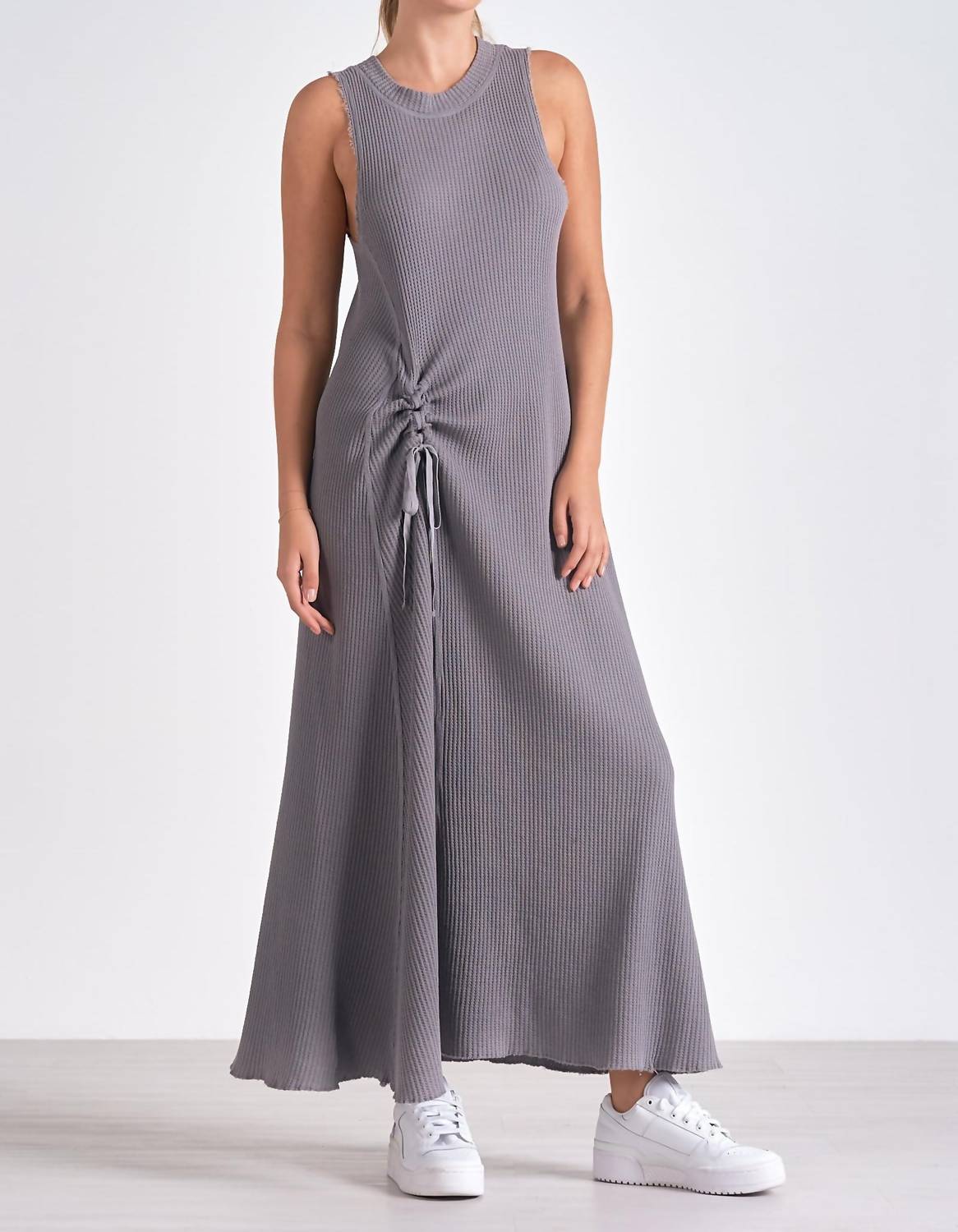 Who doesn't love a good maxi dress? This one you'll be reaching for season after season. ROUND TANK TOP CUT AND CINCHED DETAIL ON THE HIP CREATES A PERFECT SIHLOUTTE.