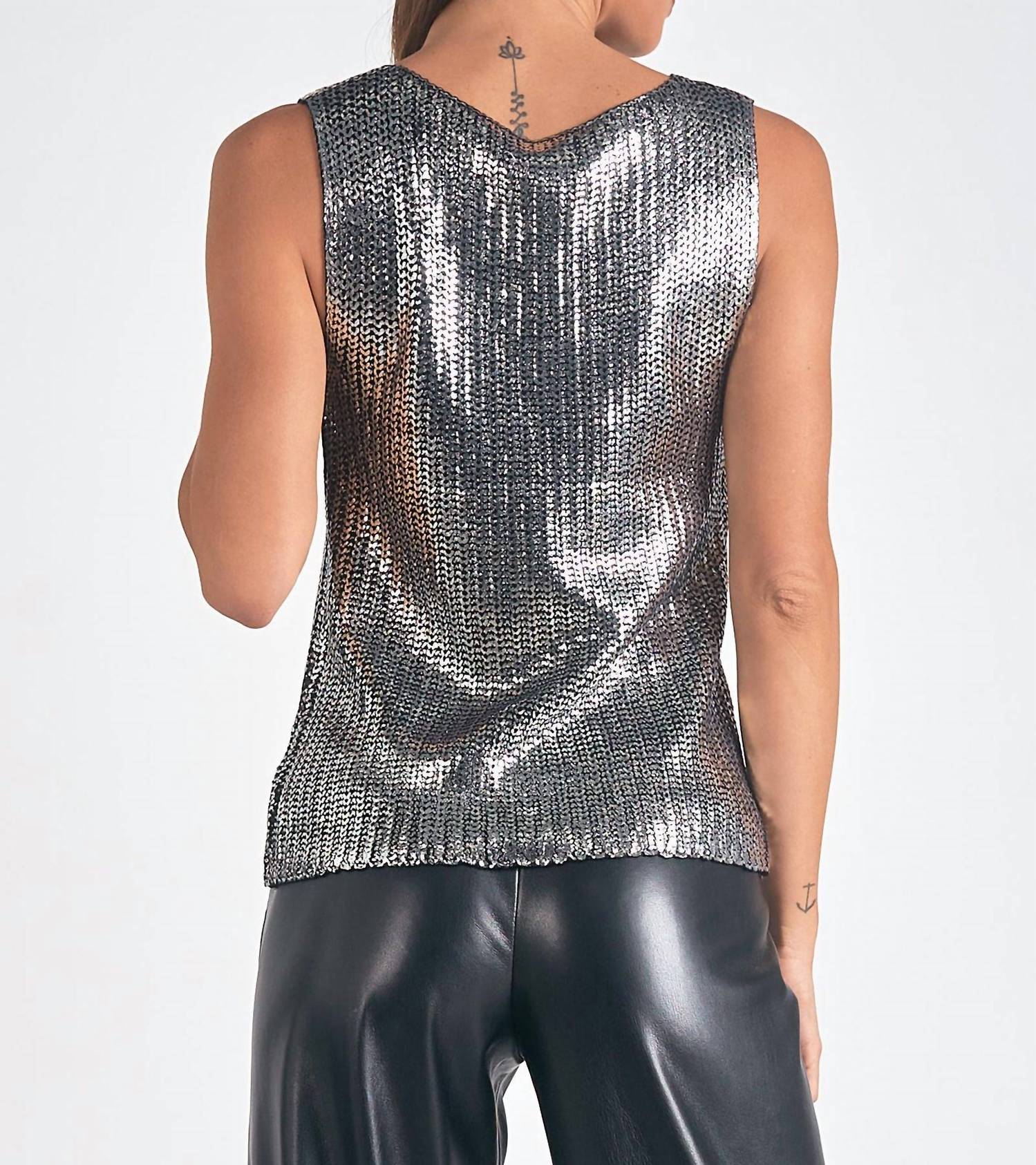 Experience the perfect blend of comfort and style with this trendy crew neck sweater, designed to effortlessly elevate your wardrobe. Pair it with your favorite denim and loafers for the perfect look. Introducing the Metallic Sleeveless Sweater by ELAN, an eye-catching piece perfect for adding sparkle to your wardrobe. This women's top features a sleek silver sheen and a classic crewneck design, making it a versatile choice for spring vacations. The sweater has a convenient pull-on closure and a tie-dye pattern to keep you on trend with 90s fashion. Care for this standout piece is simple: machine wash on a gentle cycle and line dry to maintain its luster.