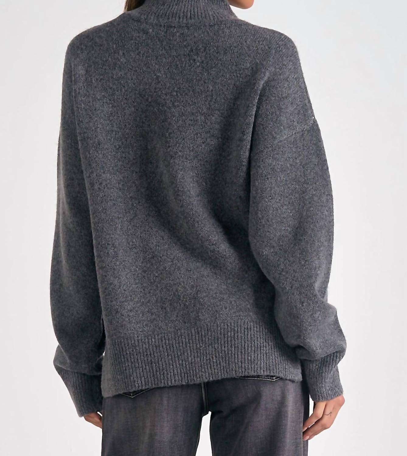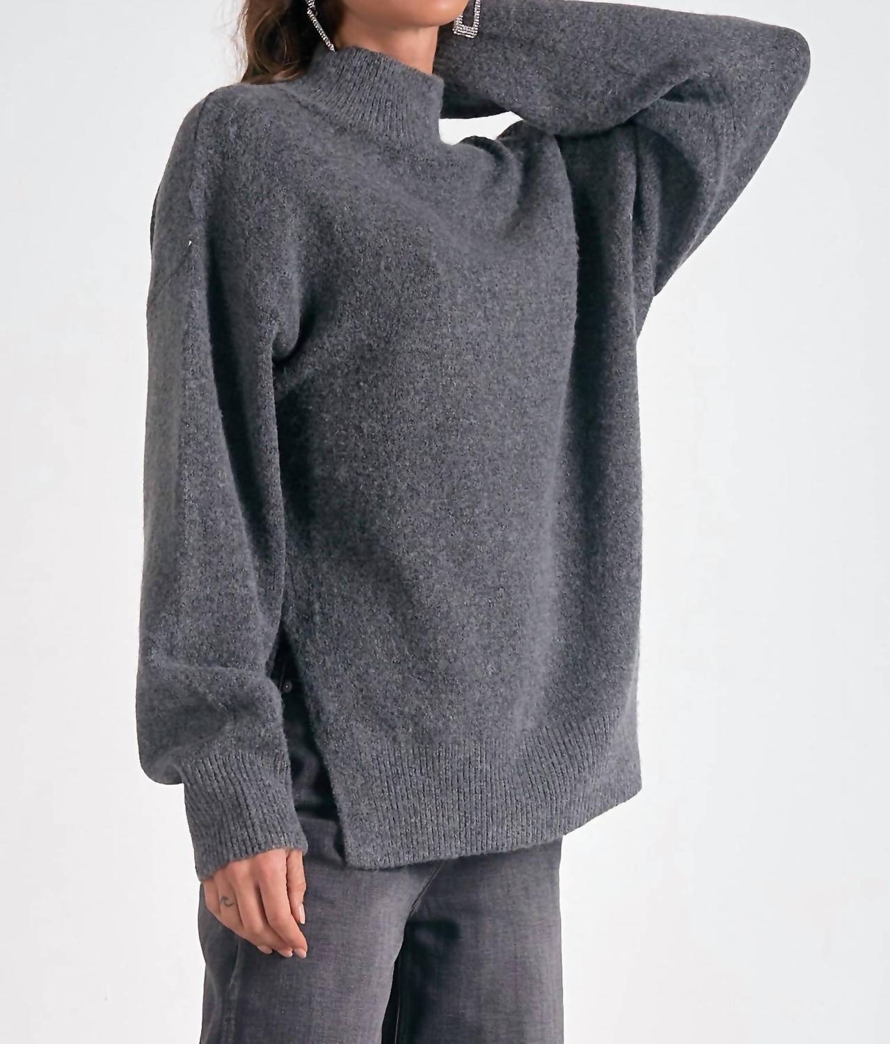 Stay warm and stylish in this versatile and effortlessly cool knitwear staple. Wear it alone or layered, it's the perfect sweater for the season and you'll wish you had it in every color. Elevate your fall wardrobe with the ELAN Mockneck Side Slit Sweater in a sophisticated dark grey, perfect for evening events with its stylish textured pattern. This women's sweater boasts long sleeves and a chic mockneck, crafted from a blend of 74% acrylic, 22% nylon, and 4% spandex for a comfortable fit. With a convenient pull-on closure, it's an ideal choice for those busy workwear days.