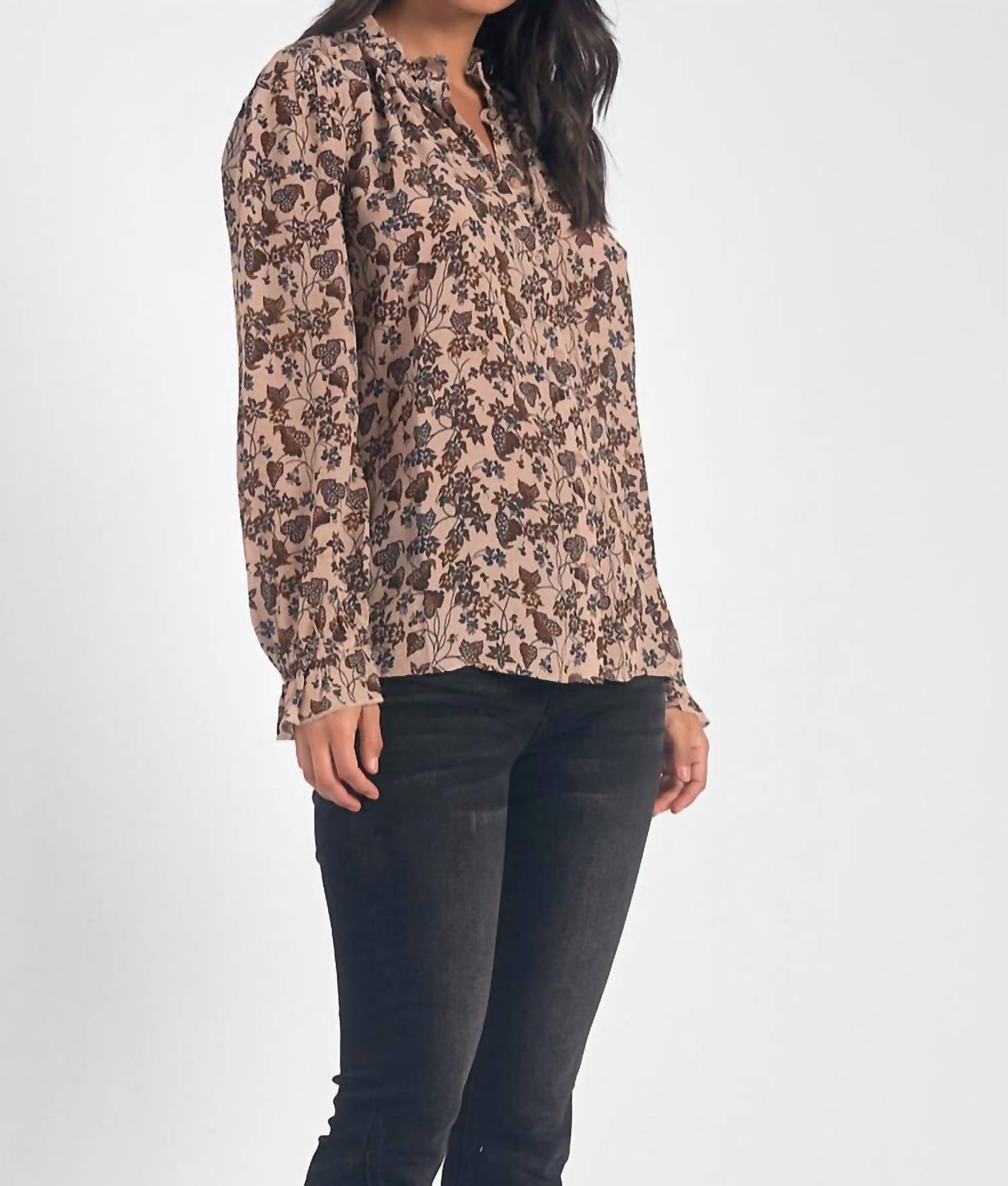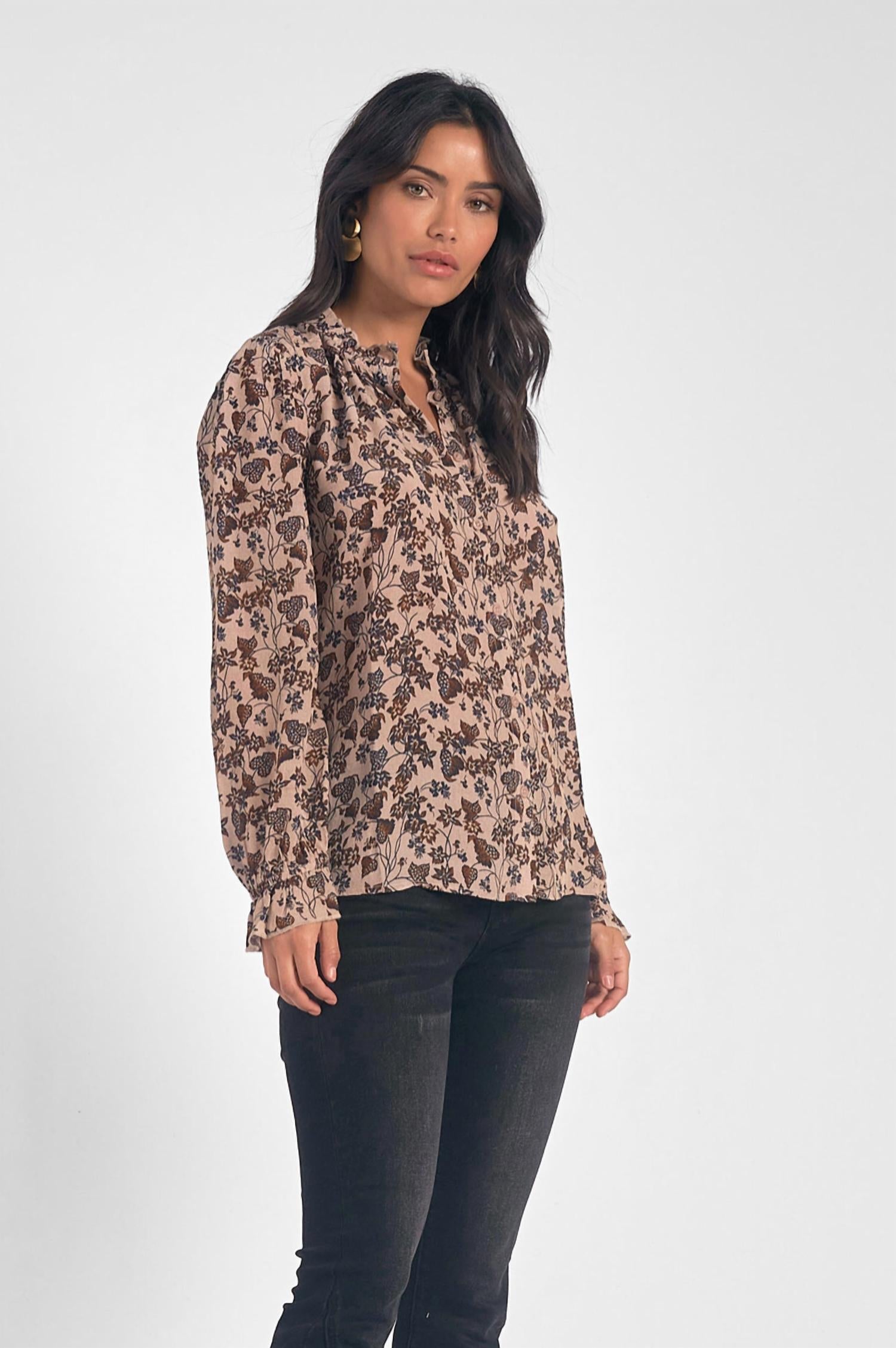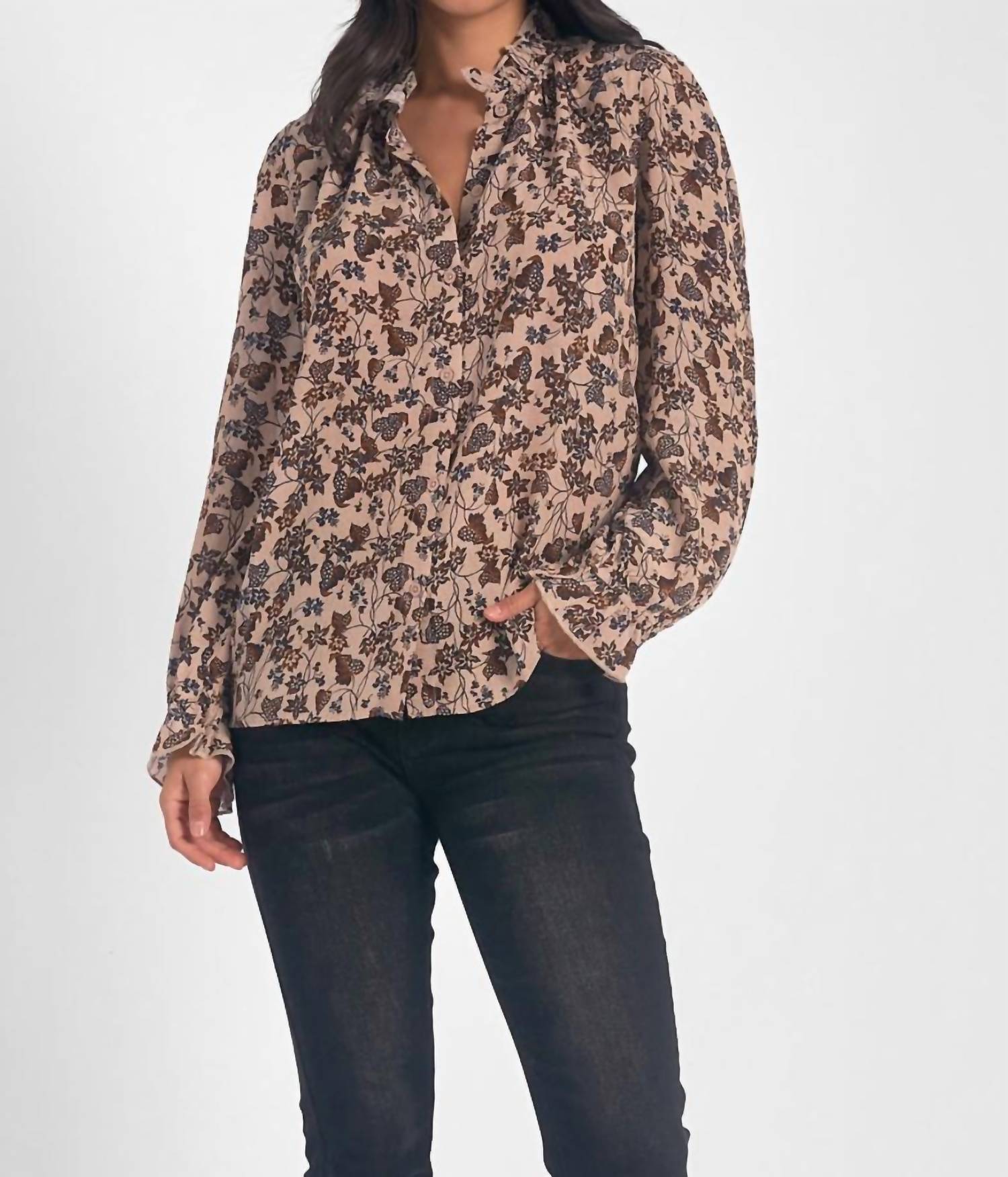 Pair this with your favorite jeans and slides for your next girls night out. Napa print. Ruffle collar, Long sleeves, cinched ruffle cuffs. Front button placket. Lined. Designed for a relaxed fit. Model measurements: 5'10" wearing a size small. Height: 33.5", Bust: 23.5", Waist: 34.5" hips. Fits true to size. 100% viscose. Hand wash. Made in India.