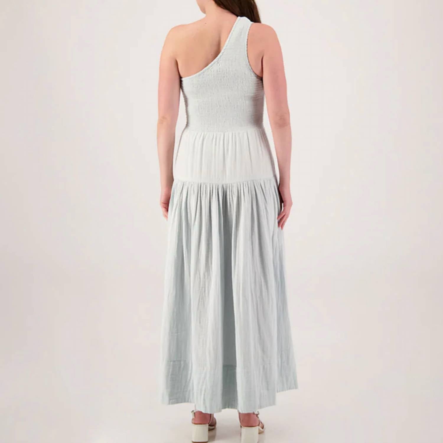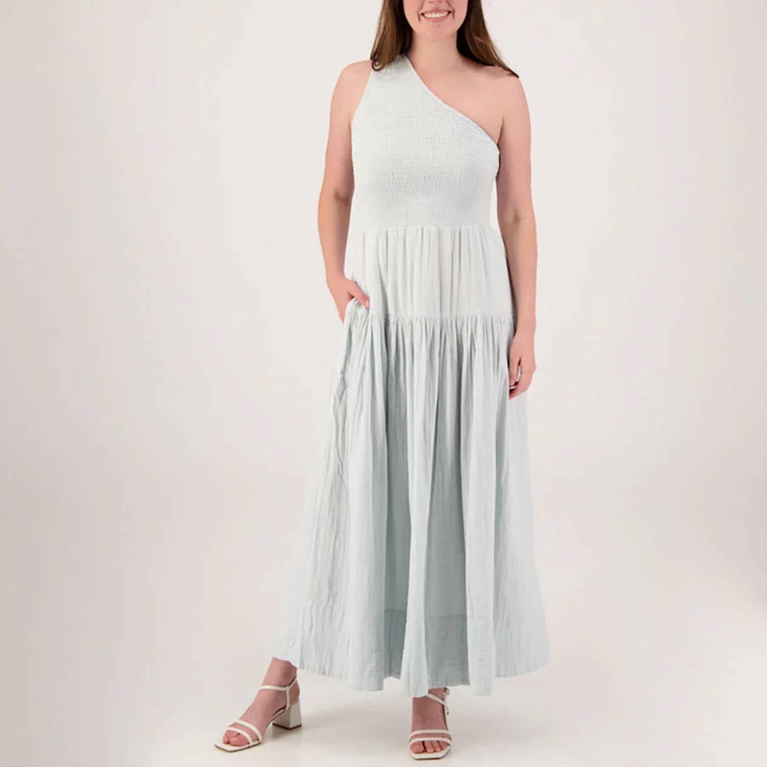 Introducing the ELAN One Shoulder Smocked Maxi Dress, a chic and sophisticated option in a solid natural hue. This sleeveless, off-the-shoulder dress is crafted from breathable cotton and features an airy A-line silhouette for graceful movement. Designed for easy wear with a convenient pull-on closure, it includes practical pockets for added functionality. Care for this elegant piece by hand washing and line drying it to maintain its stunning look.