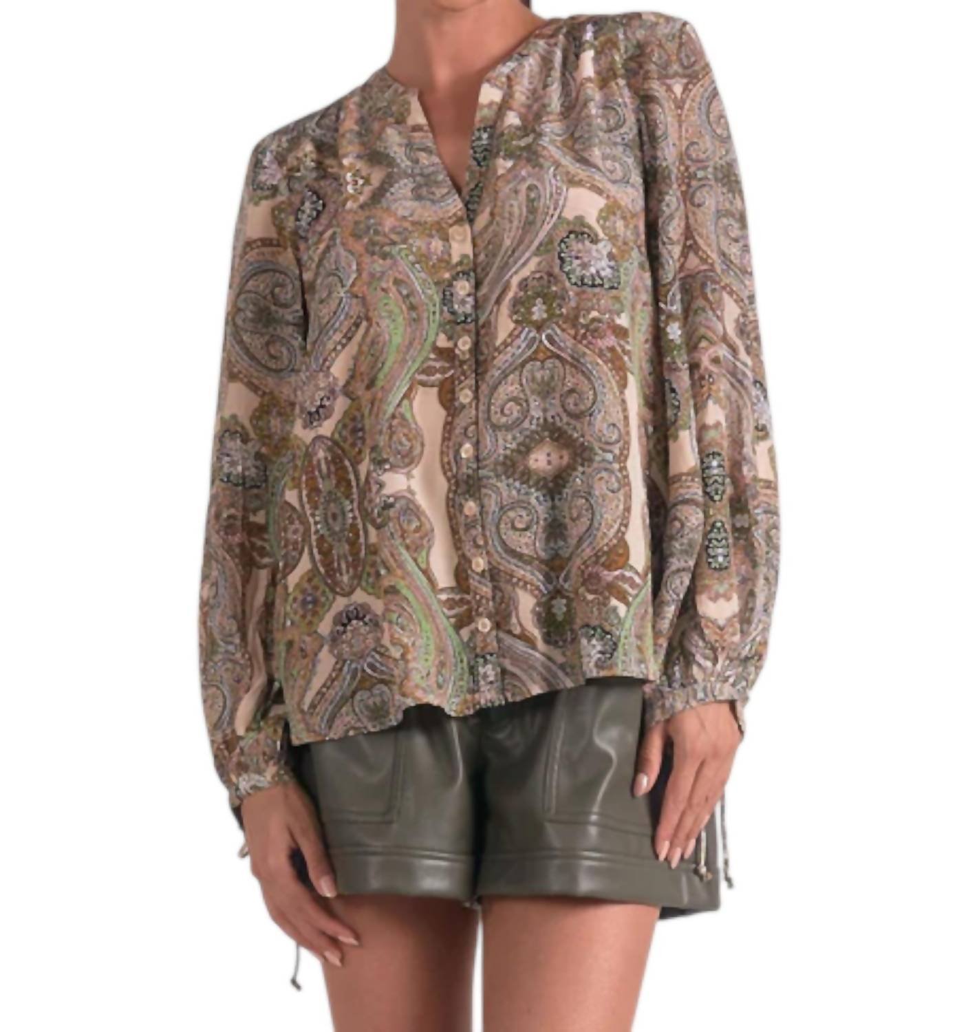 A versatile blouse that works from desk to dinner! Discover timeless elegance. Crafted from 100% viscose for a silky finish. Features long balloon sleeves with tie cuffs. Enhancing its sophisticated beige paisley print. Split V-neck flows effortlessly into a button front, creating a graceful silhouette. With its lightweight fabric and flowing design.