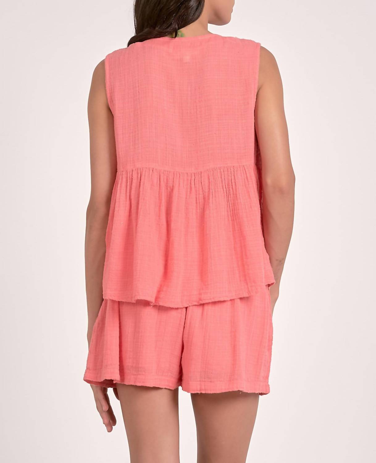 This classic tank top is perfect for layering and cute enough to wear on its own. Introducing the ELAN Peplum Gauze Tank, a sleeveless top perfect for breezy summer outings. This pink textured tank features a relaxed fit and a tie closure, adding a chic flyaway detail to your vacation wardrobe. Crafted from a cotton blend with a 100% cotton lining, it ensures comfort and breathability. Care for this stylish piece by hand washing and line drying.