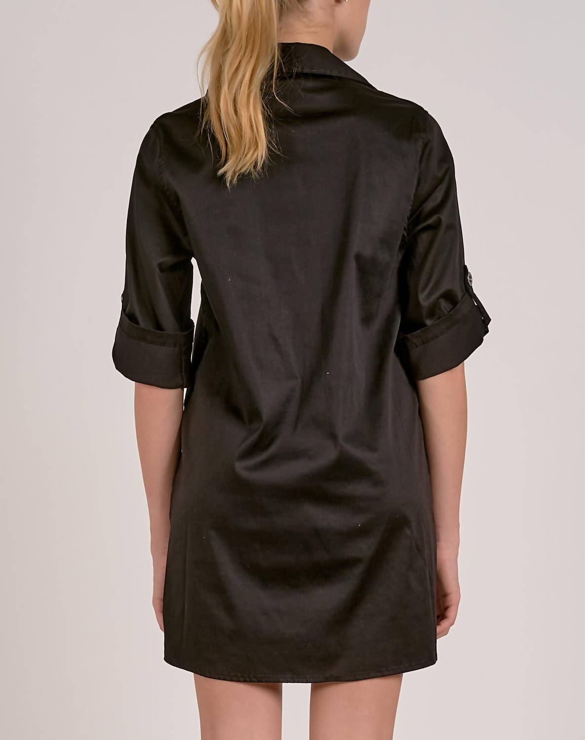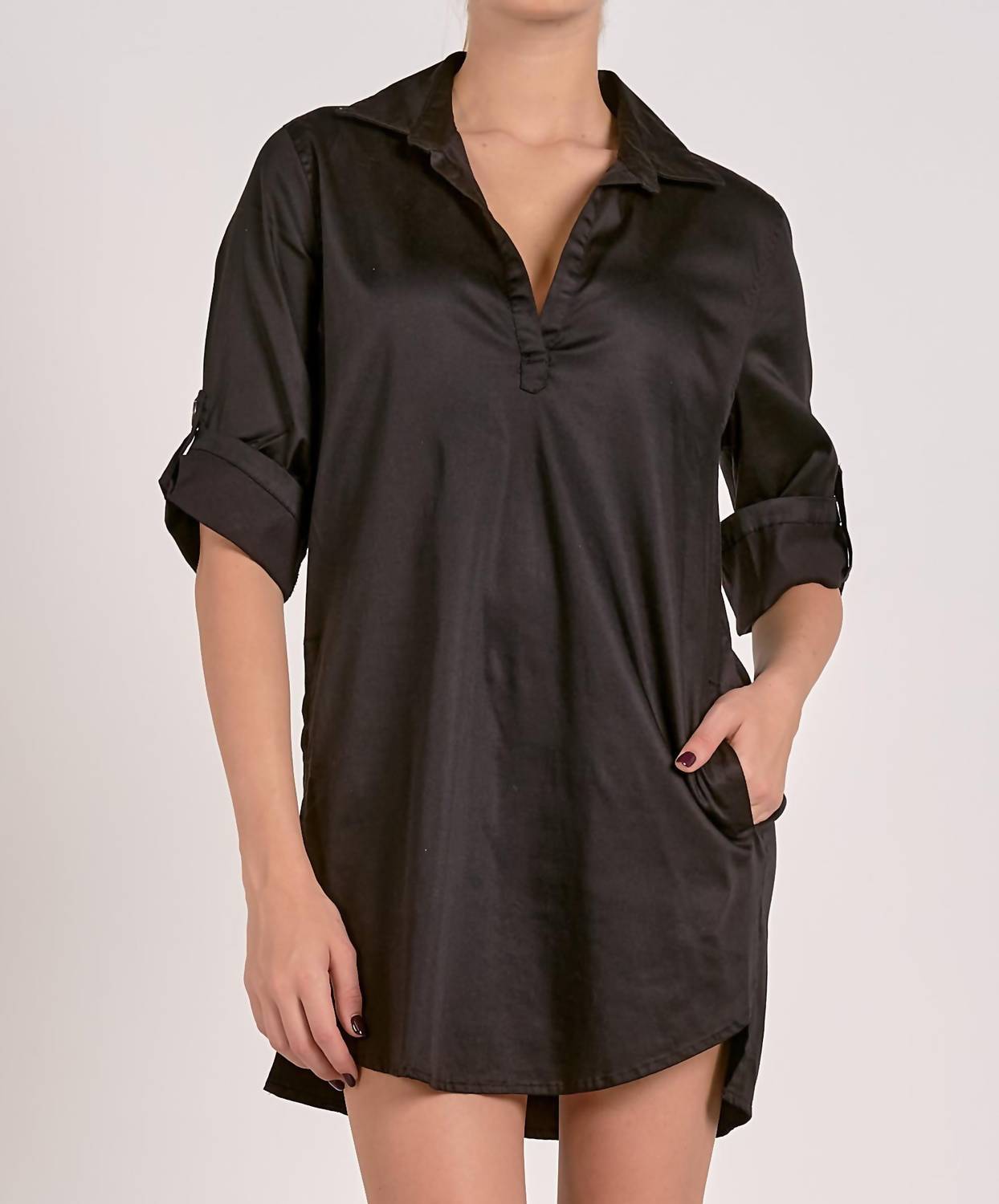 Pair this with your favorite jeans and slides for your next girls night out. Introducing the ELAN Roll Tab Shirt, a sophisticated black blouse that combines comfort with style. This shirt features a flattering collared neckline with three-quarter sleeves, finished with a rolled cuff and button tab detail. Style: Solid color, Pull-on closure. Ideal for women seeking a sleek addition to their wardrobe.