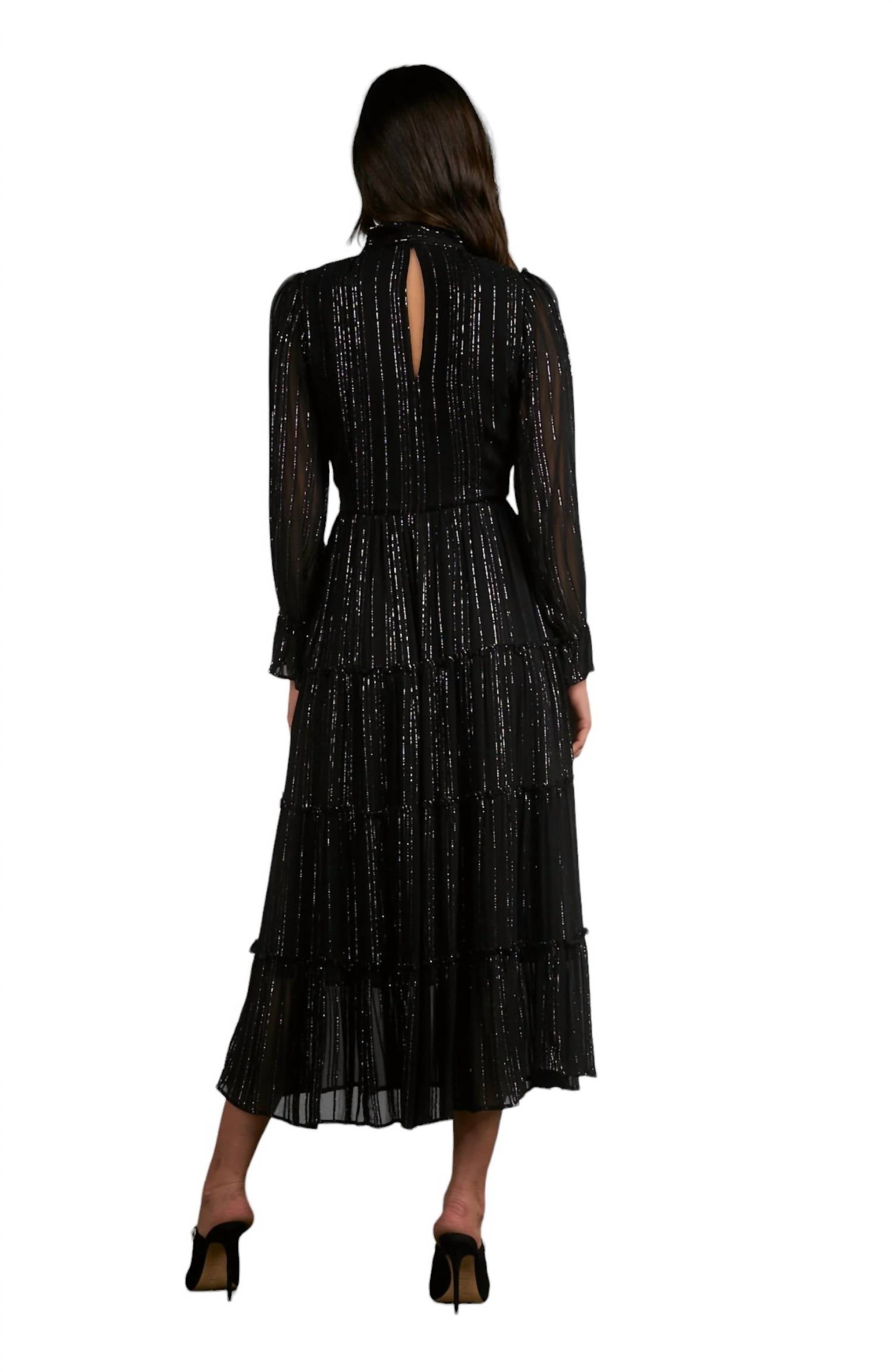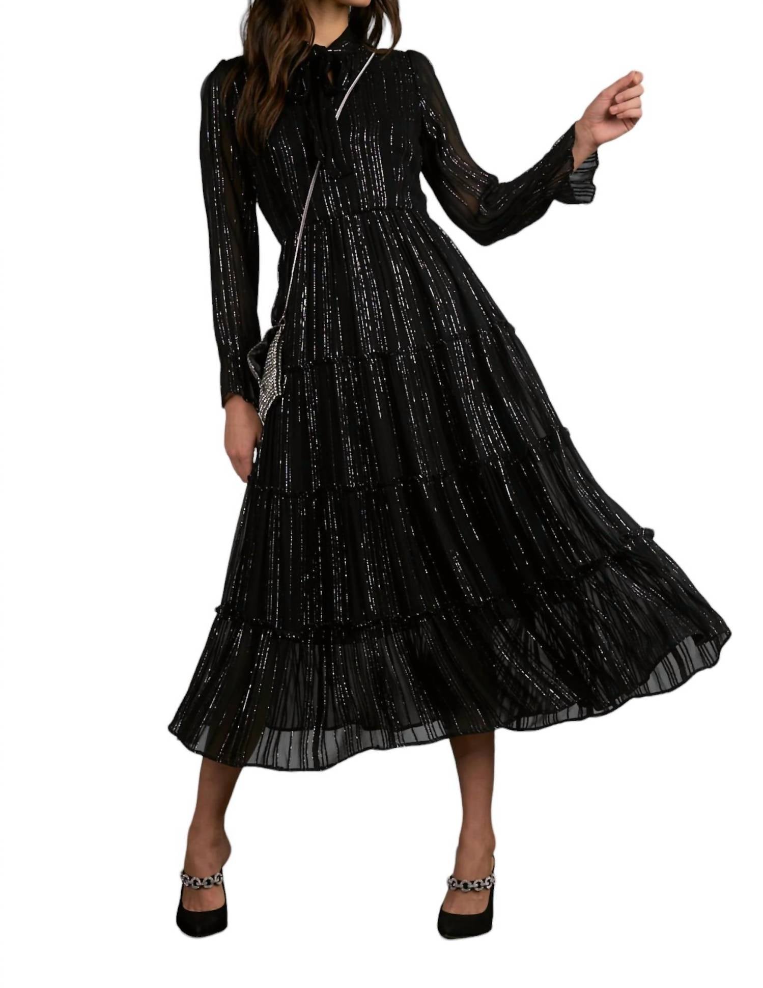A maxi dress that is just as cute as it is comfortable.This Shimmer Stripe Maxi Dress features a Long Sleeve. Front neck tie. Cinched at the waist. Tiered