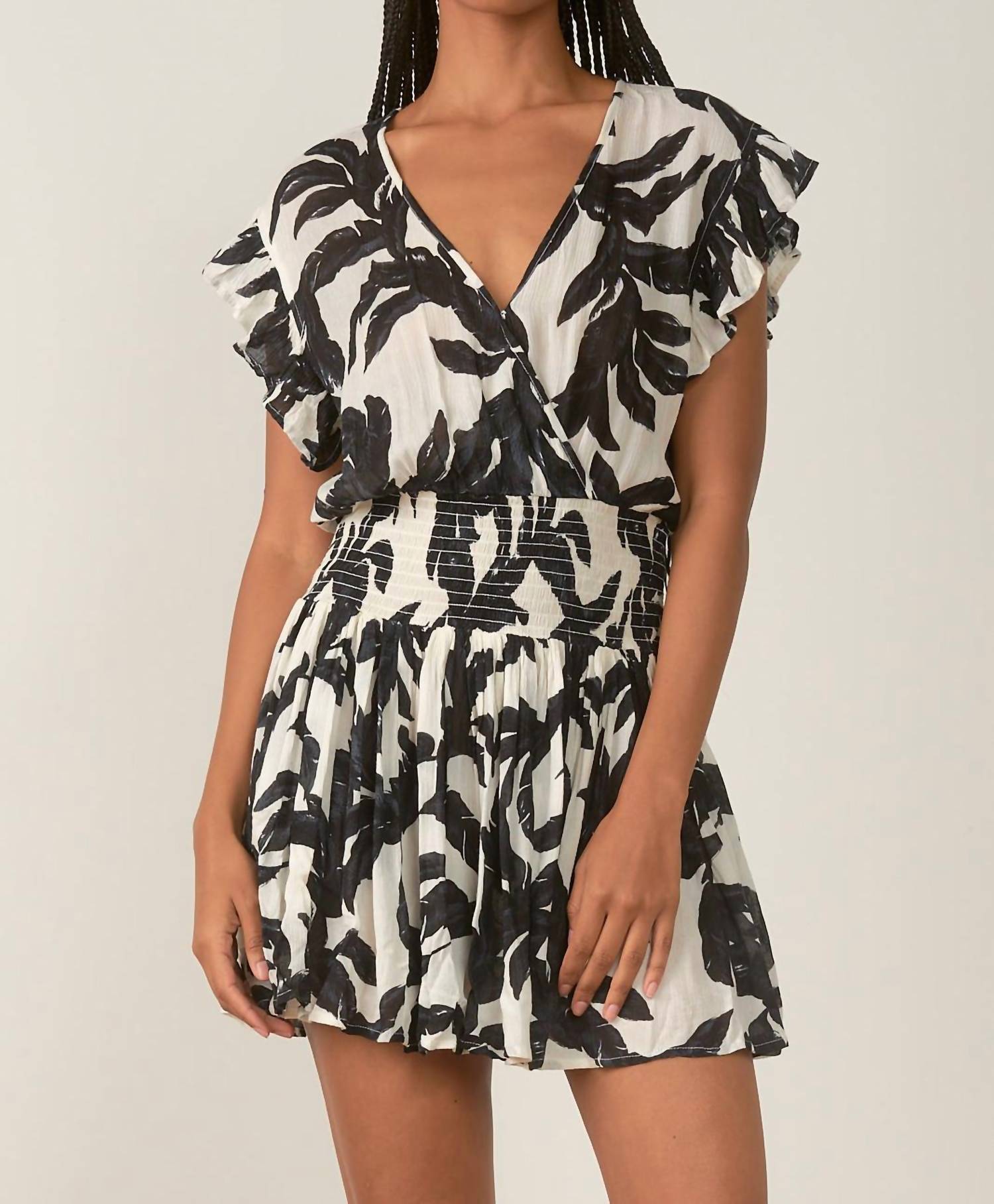 The perfect mini dress for those warmer months. Meet the Short Sleeve Smock Waist Dress by ELAN, a chic piece in cream and black featuring a playful leaf print. Designed with flutter sleeves and a flattering A-line silhouette, this dress boasts a V-neckline with a convenient snap closure. The airy material is crafted from soft rayon, making it an ideal choice for casual outings. Care for this dress by hand washing it to maintain its elegance.