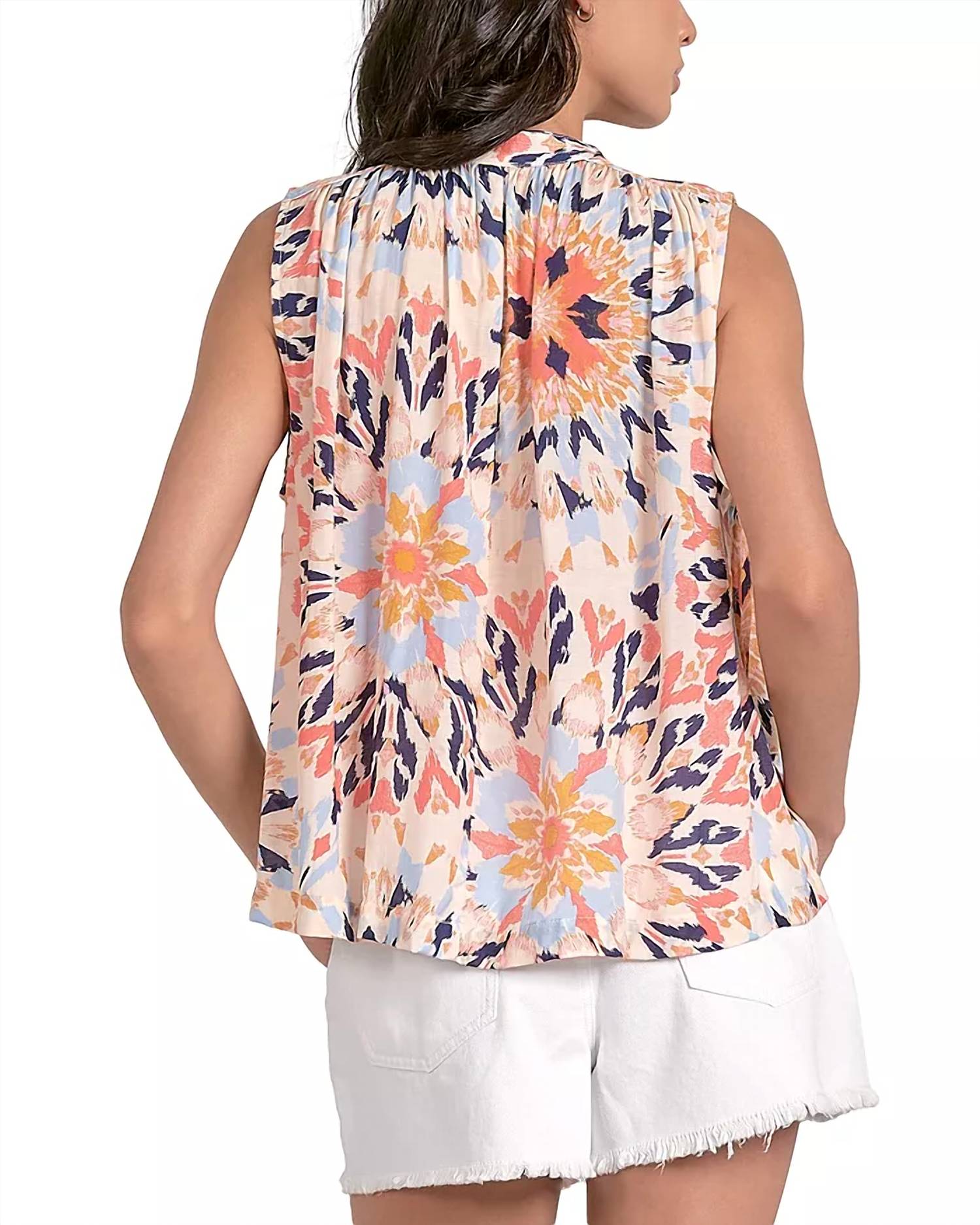 A versatile blouse that works from desk to dinner! Embrace effortless elegance with the ELAN Sleeveless Flowy Top, perfect for summer getaways or festive occasions. This vibrant multi-colored blouse features a whimsical allover print and a split V-neck with charming ties. Crafted from premium viscose in a relaxed, pullover style, it ensures comfort and style. Care is simple with a hand wash and line dry.