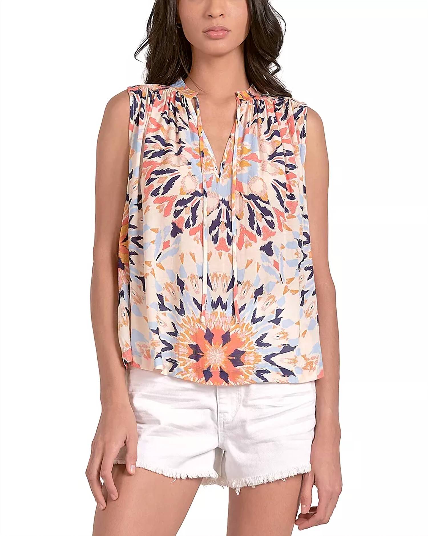 Embrace effortless elegance with the ELAN Sleeveless Flowy Top, perfect for summer getaways or festive occasions. This vibrant multi-colored blouse features a whimsical allover print and a split V-neck with charming ties. Crafted from premium viscose in a relaxed, pullover style, it ensures comfort and style. Care is simple with a hand wash and line dry.