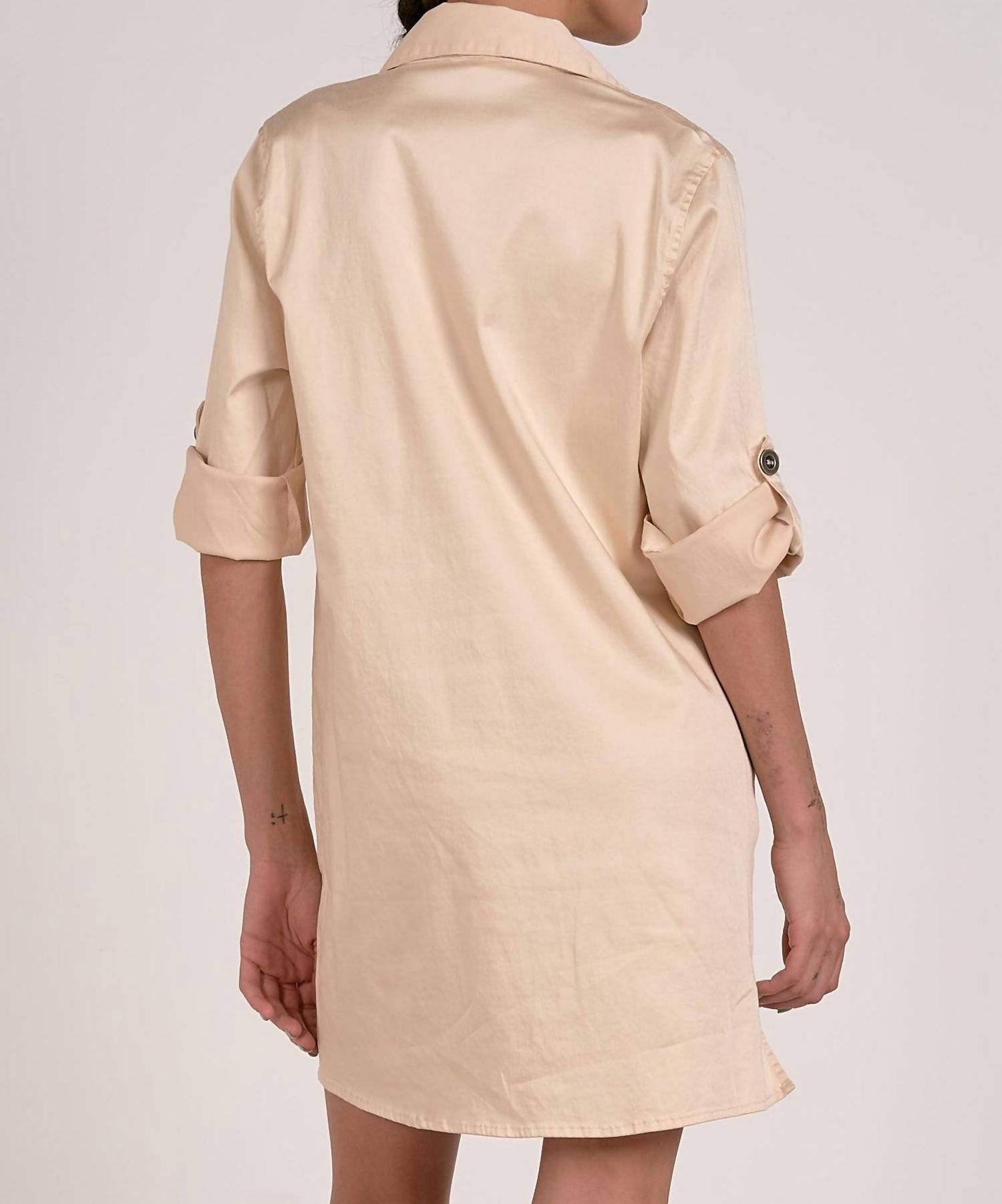 A short and breezy dress for those warmer days. Elevate your wardrobe with the Stone Shirt Dress by ELAN, a beige mini dress perfect for spring adventures and workwear trend. Featuring three-quarter sleeves that roll with a button, this shorter length dress offers a stylish V-neckline with a collar and convenient side pockets. Made from a soft blend of 60% lyocell, 37% cotton, and 3% spandex, it combines comfort with a chic silhouette. This pull-on shirt dress requires hand washing with no bleach and can be medium ironed or dry cleaned.