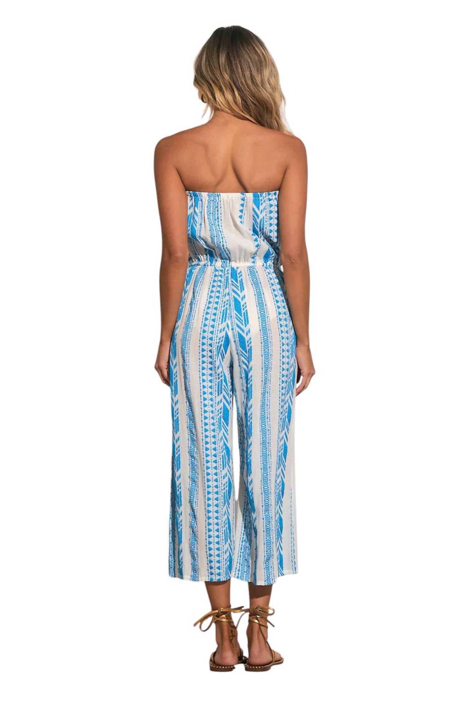 This strapless jumper features a wide-leg design, a waist tie, and side pockets. It runs true to size and is made from 75% cotton and 25% polyester.
