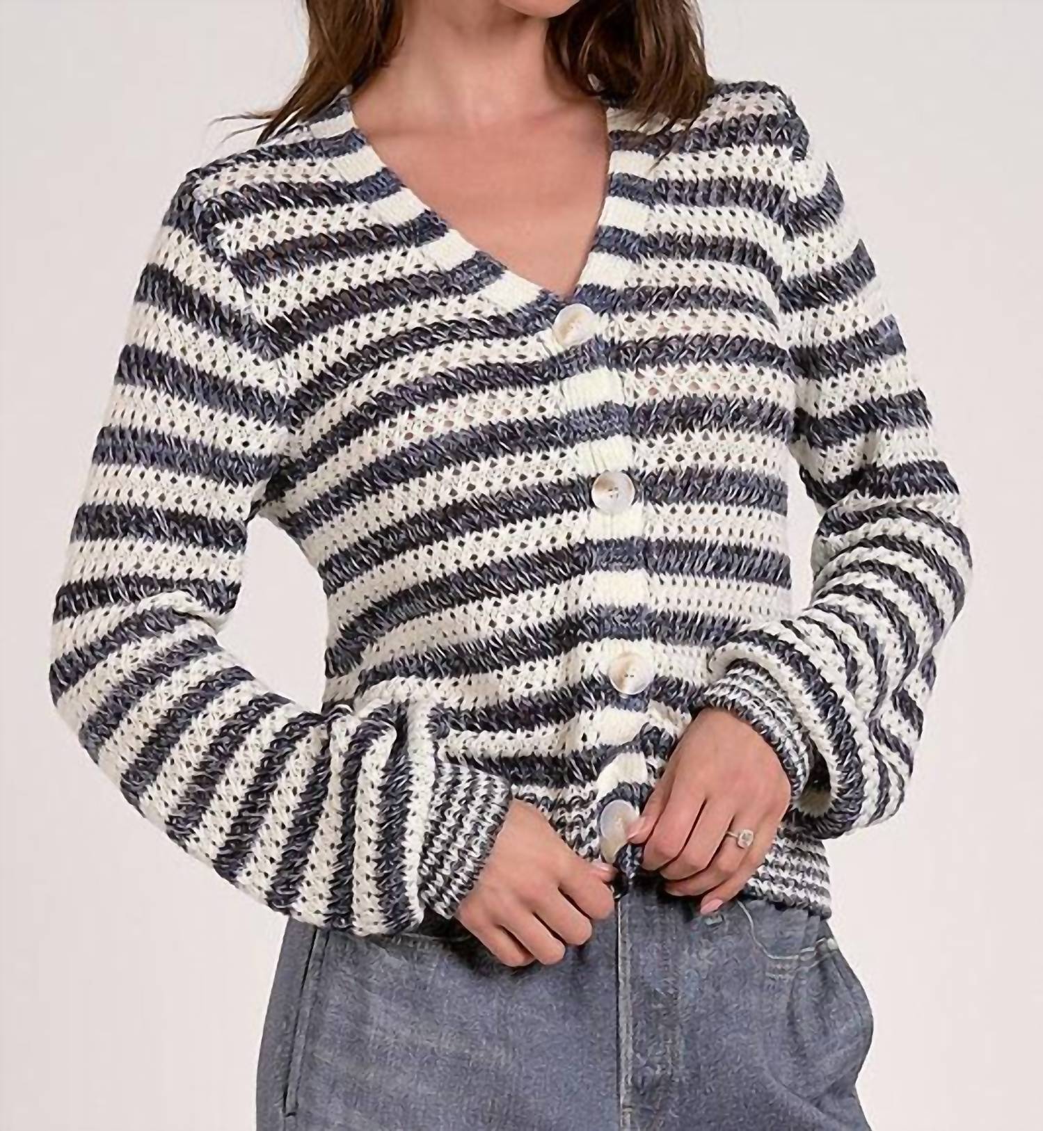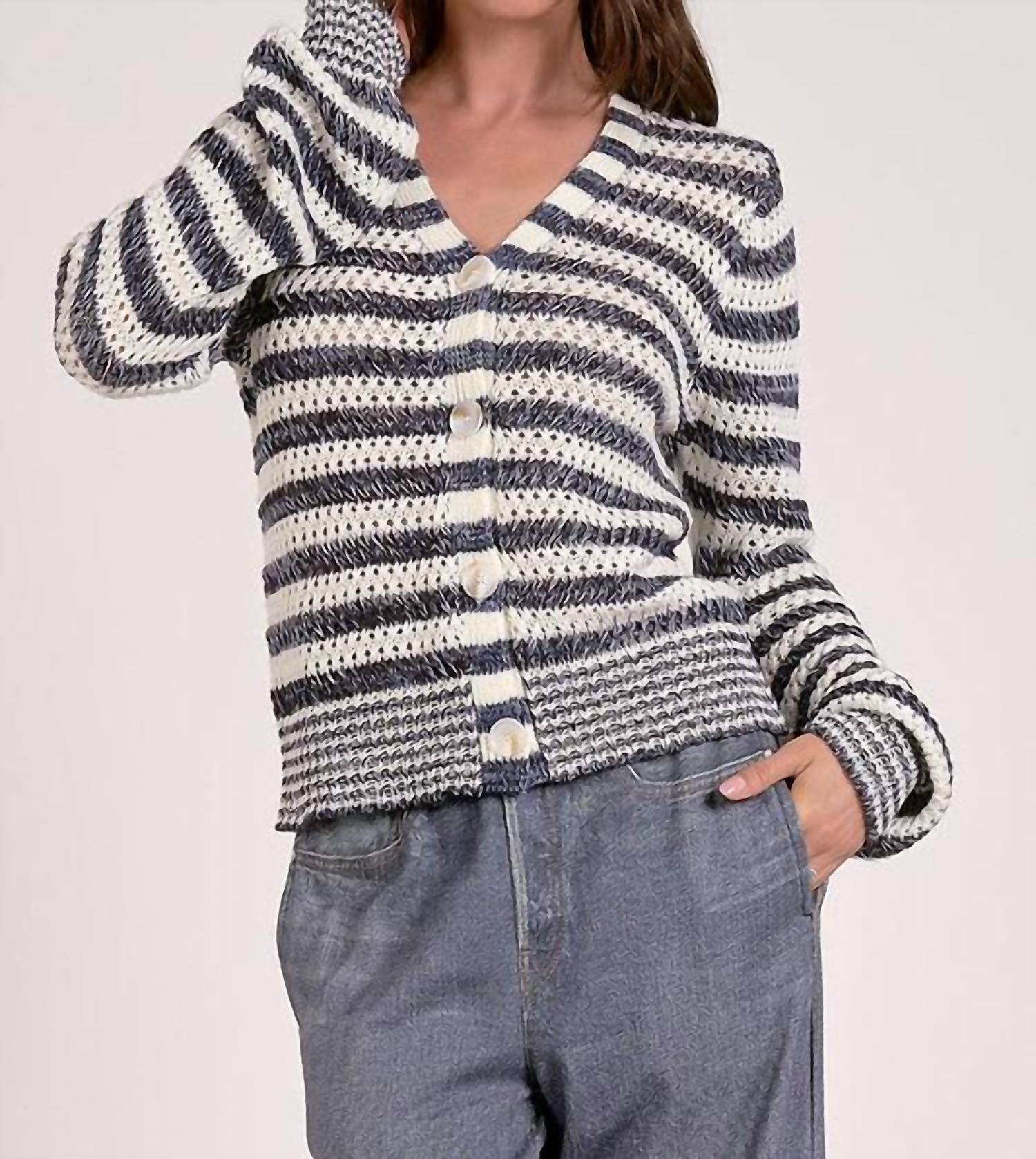 This cardigan will be a sweater-rotation favorite. Introducing the Elan Stripe Cardigan, a chic addition to your wardrobe with its timeless navy stripe pattern. Designed with long sleeves, this cardigan offers a flattering V-neck and a practical button closure. Made from a cotton blend, it ensures comfort and style throughout spring and summer. Care: Hand wash and lay flat to dry for best results.