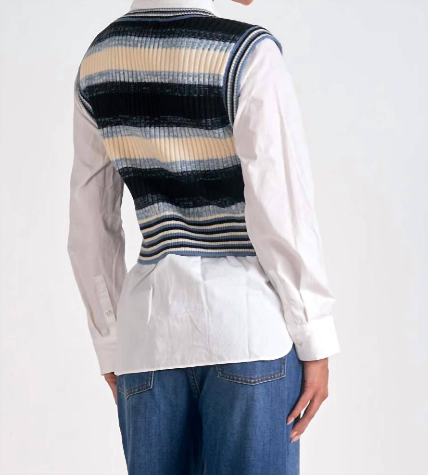 This Sweater Vest Shirt features a multi-striped knit sweater vest over a classic white button-up shirt. Crafted from 42% acrylic, 30% polyester, 28% nylon, and 100% cotton, it offers a V-neck design and pull-on closure for a blend of style and comfort.