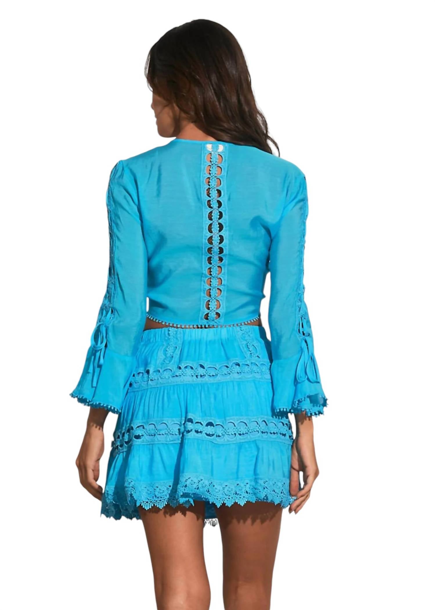 Show a little skin in this cute and casual crop top. This crop top is ideal for warmer weather. It features intricate crochet details, ruffled three-quarter sleeves, and an adjustable tie front for a customizable fit. 50% Viscose, 30% Polyester, 20% Polyamide.