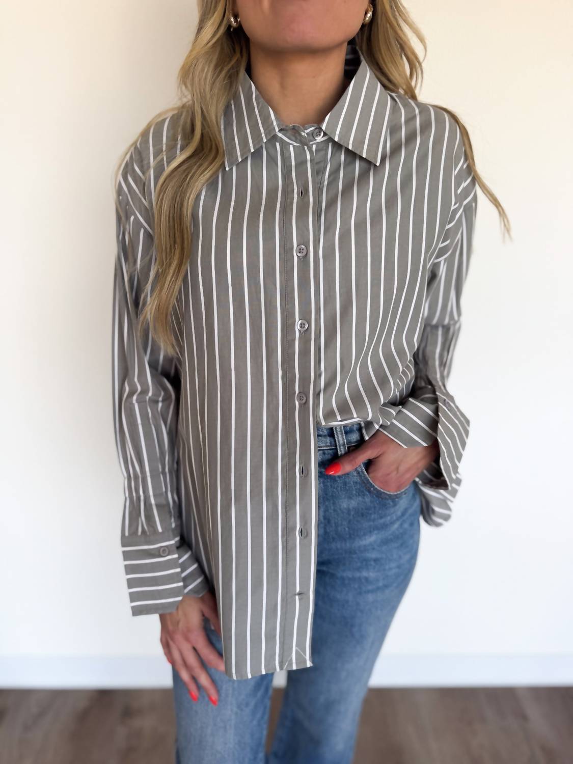 Perfectly tailored and soft to the touch. Introducing the Treasure Button Down Top by ELAN, a sophisticated choice in grey and white stripes that seamlessly transitions from office to evening. Featuring long sleeves and elegant arm and cuff detailing, this top is tailored to add a touch of class to any outfit. Closure: Button closure. Perfectly pair it with tailored pants or casual denim for a versatile look that spans multiple occasions.