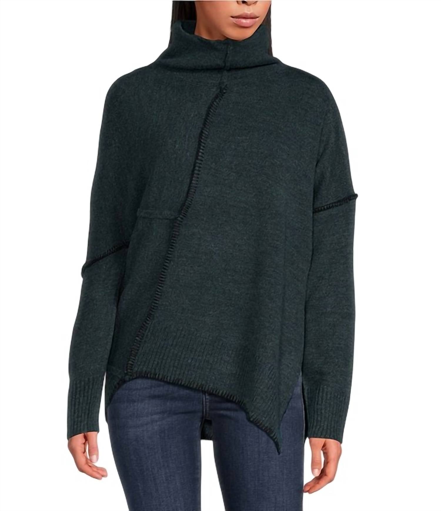 Sweater knit fabrication. Turtleneck neckline. Long sleeves. Black & white stitching. Loose fit. Asymmetrical hemline. Pullover construction. Approx. 28" length. Acrylic/nylon/polyester. Hand wash. Imported.