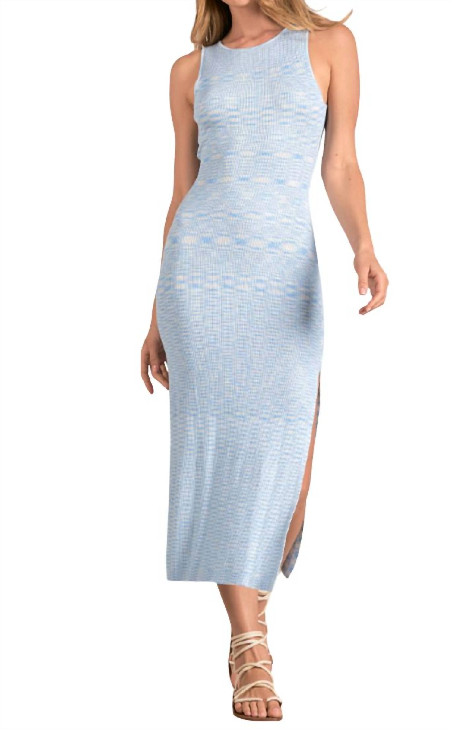 Sleeveless design with a round neckline. Twist-back detail with a cutout. Side slit. Ribbed texture with a fitted silhouette. Midi length.