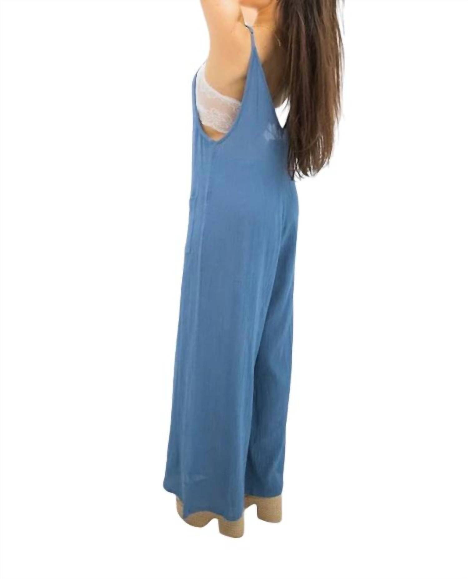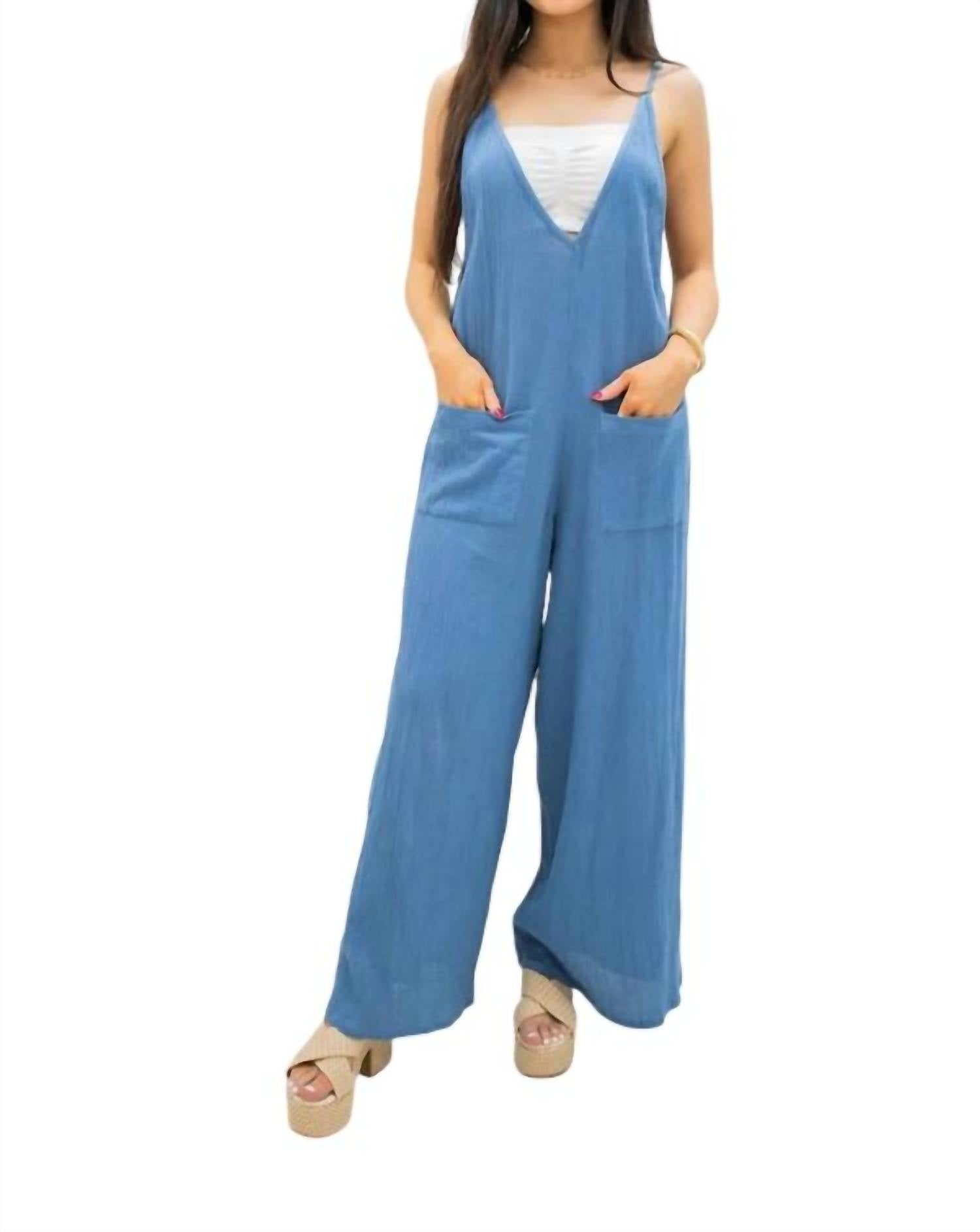 This wide-leg jumpsuit offers both style and functionality. With convenient pockets and a loose fit, it is perfect for any occasion and balances comfort with a chic silhouette. 100% Cotton. Hand wash cold, do not bleach, hang to dry.