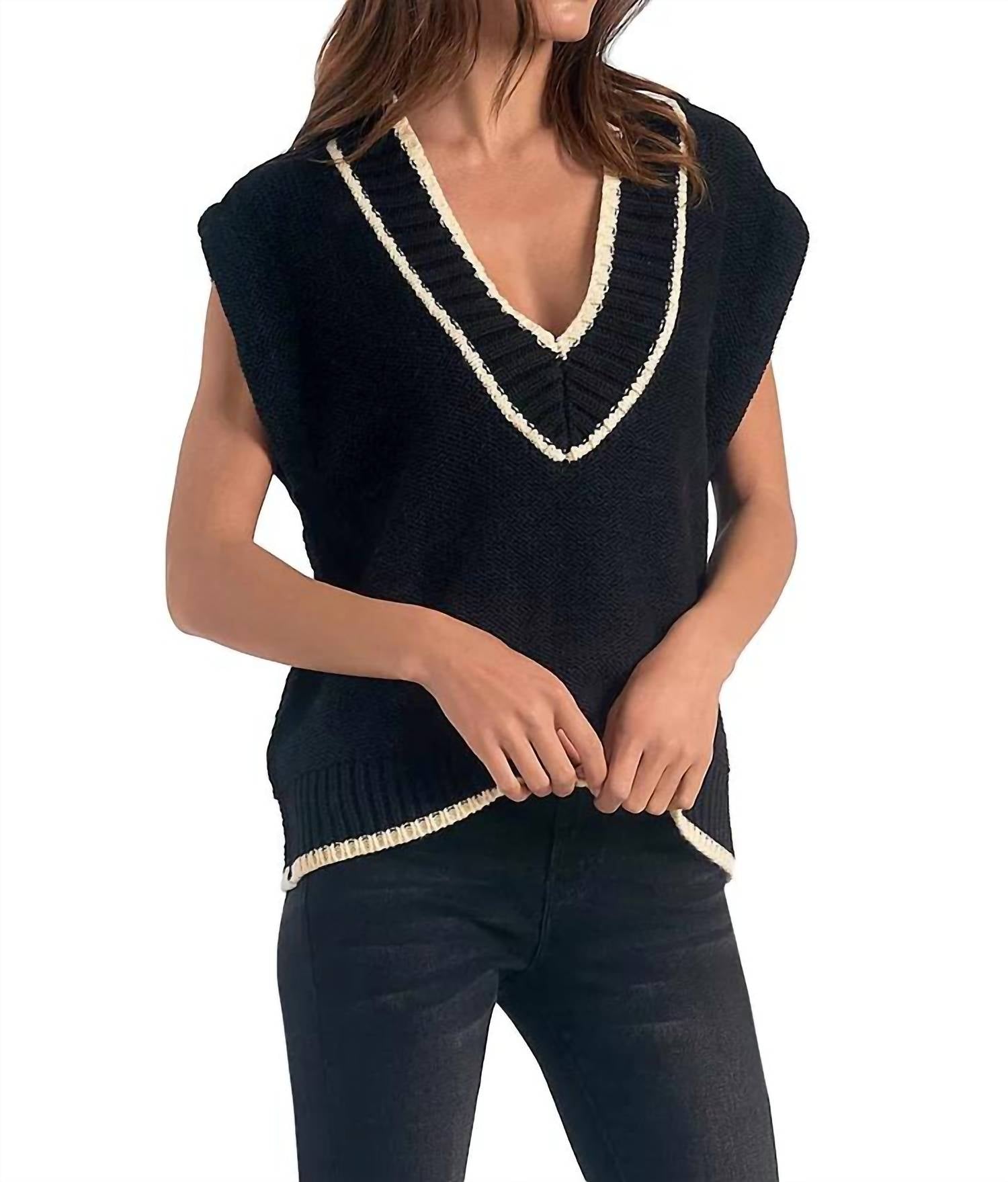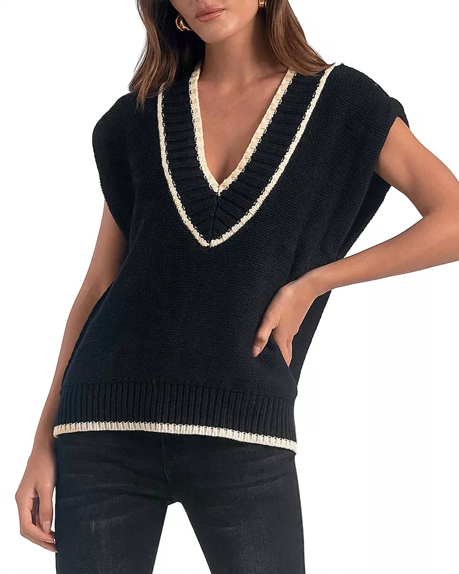 You'll be reaching for this comfy and classic v-neck sweater all season long. Elevate your style with the ELAN V Neck Sweater Vest in sleek black, designed for women who appreciate a sophisticated textured look. This sleeveless vest features a V-neckline and ribbed trim at the neck and hem, adding classic details to your outfit. Made from a cotton blend of 55% cotton and 45% acrylic, it promises comfort while being easy to pull on. Imported and true to size, it is best maintained with a gentle hand wash. The model is wearing a size small, standing 5'10" with measurements of 33.5" bust, 23.5" waist, and 34.5" hips.