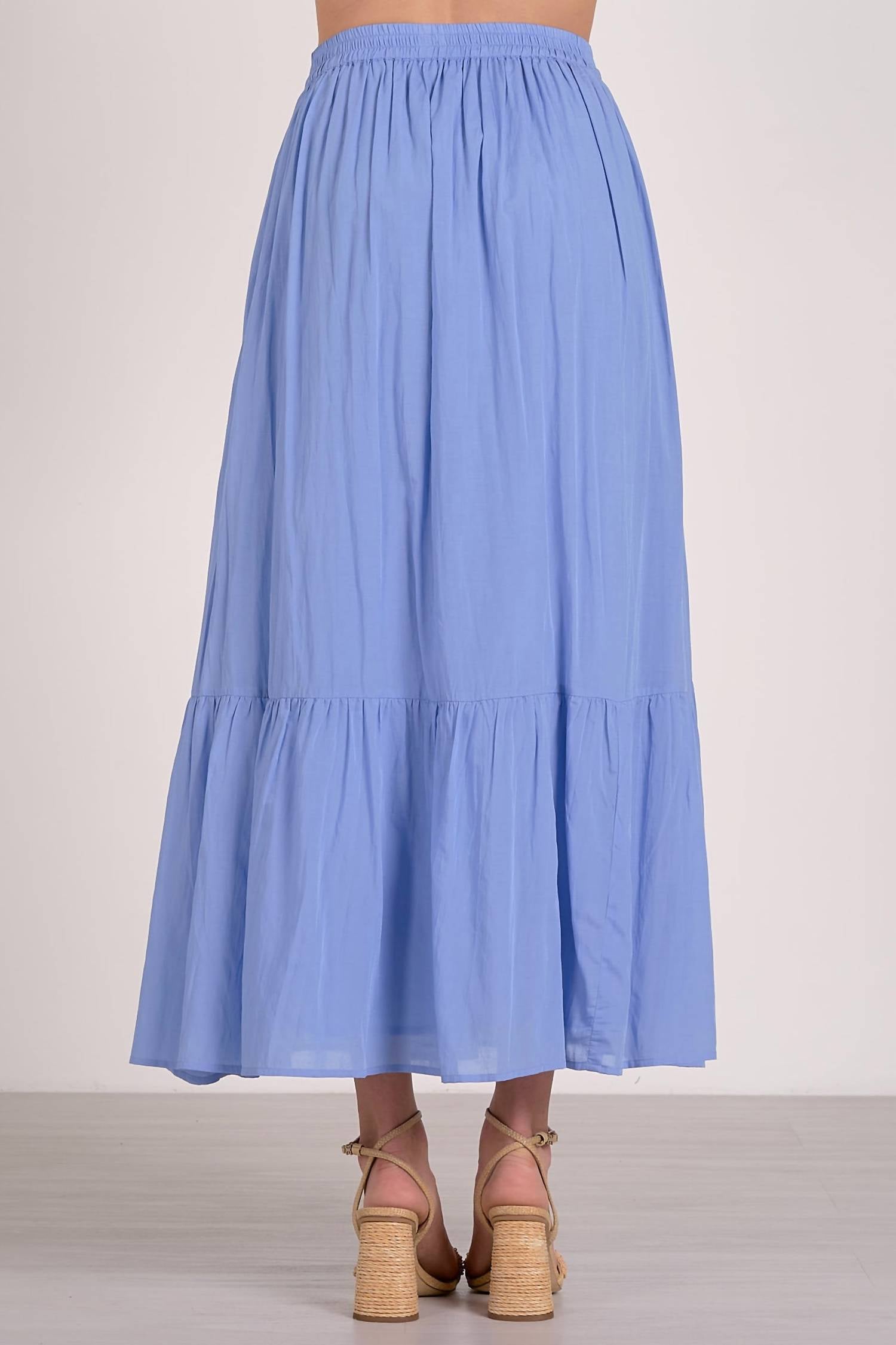 Tuck your favorite tee into this midi length skirt for an effortlessly cool look. Elevate your summer wardrobe with the Vera Midi Skirt from ELAN, an essential piece in periwinkle blue. Featuring a textured, tiered design, this skirt offers both comfort and understated style for any vacation occasion. Crafted from a 55% Viscose and 45% Cotton blend, it’s easy to slip on with its pull-on closure. For care, hand wash and lay flat to dry. Model is wearing a size small (5’8” height, 32” bust, 24” waist, 34.5” hips).