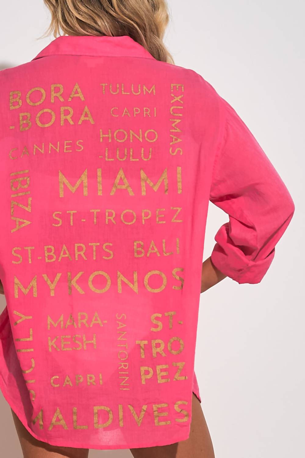 A classic button down shirt that will never go out of style. Get ready for summer with the ELAN Vista Graphic Button Down Shirt, a stylish and easy-to-wear choice for any beach day. Designed with long adjustable sleeves and a polished collar, this shirt makes a statement in hot pink with a resort-themed graphic print on the back. Crafted from 100% cotton, it promises comfort and breathability for those sunny outings. Equipped with a full button-front closure, this piece is machine washable, ensuring ease of care.