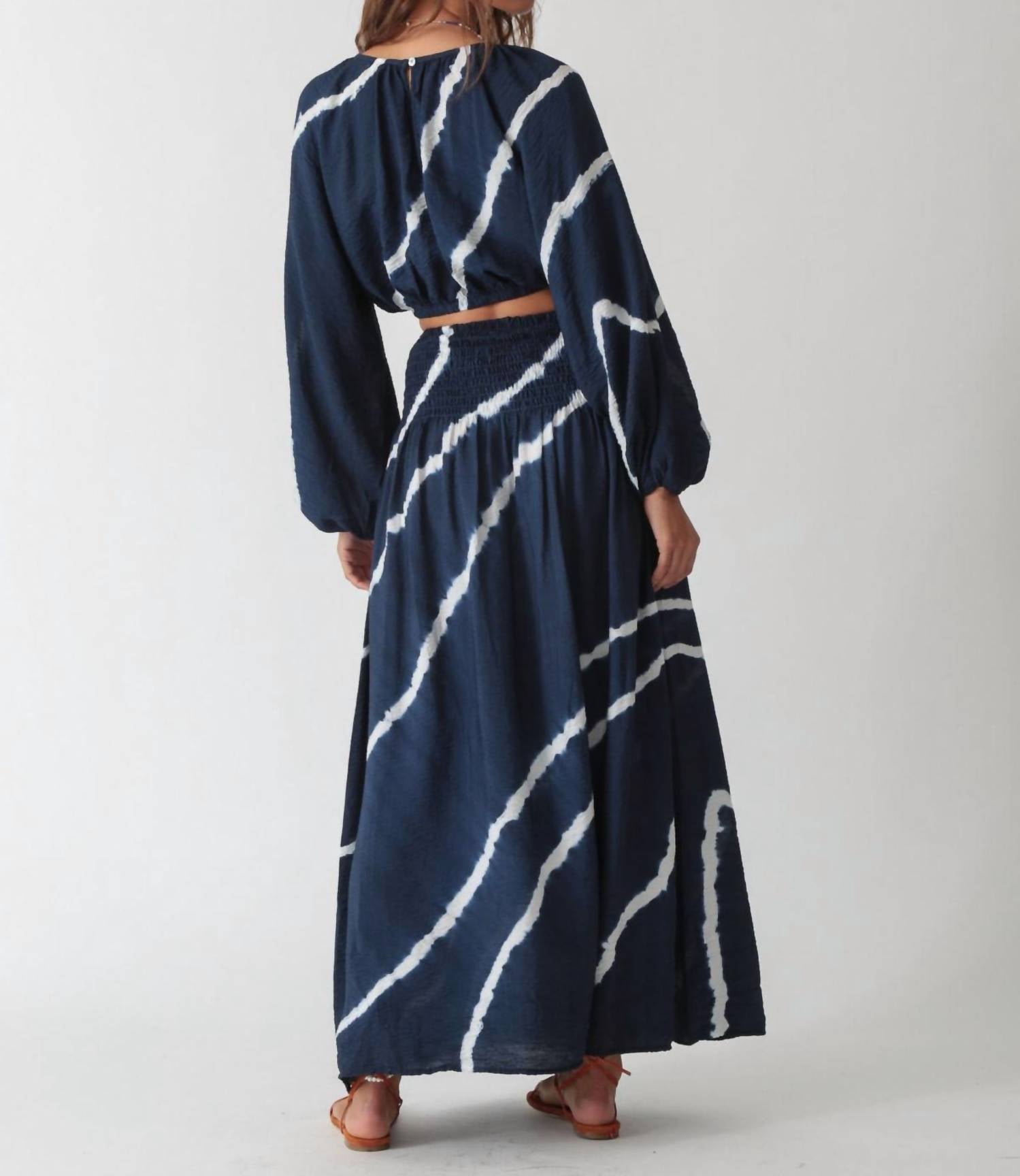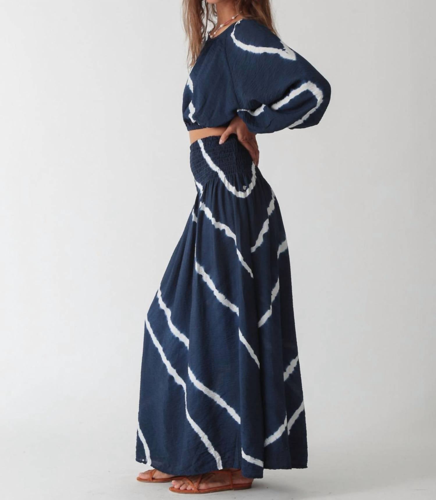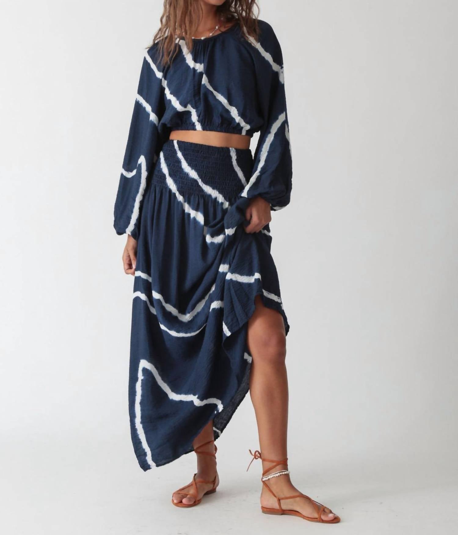 Pair this crop top with your favorite high-waisted jeans or maxi skirt. Introducing the Abigail Top by Electric & Rose, a chic addition in classic navy and white perfect for your summer wardrobe. This piece flaunts long, dramatic balloon sleeves and a stylish cropped length. Fabric: 84% Rayon, 16% Nylon. Made in the USA with a convenient pull-on design. Care: Dry clean only. Model is 5'9" and wears a size small.