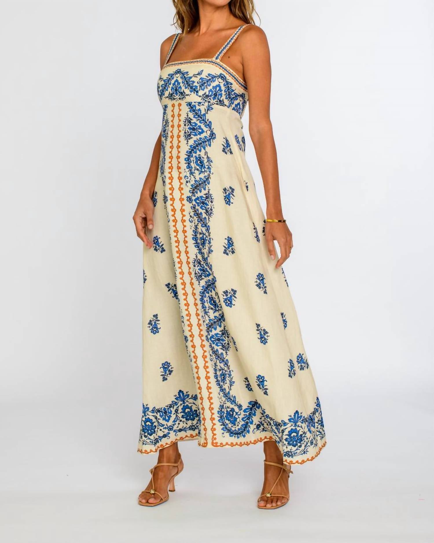 Who doesn't love a good maxi dress? This one you'll be reaching for season after season. Embrace the boho chic style with the Annalisa Dress by Elizabeth James The Label, designed for those leisurely summer days. This sleeveless maxi dress is crafted from a soft Cotton Linen blend and features an empire waist silhouette with a square neckline. Its handkerchief ivory color is adorned with a blue floral pattern and orange embroidery, adding a touch of artisanal charm. With a convenient zip closure, it's easy to wear and care for—machine wash and line dry for best results.