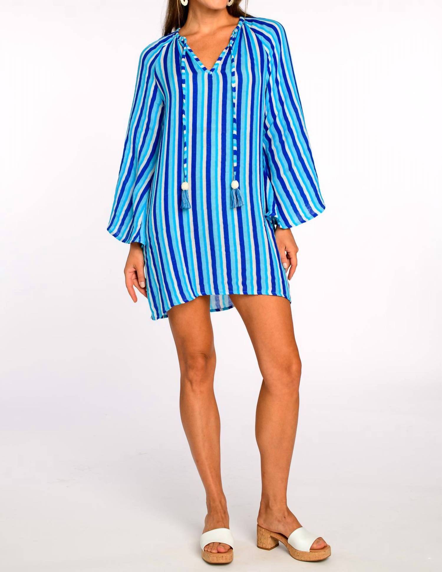 The kind of easy and flattering dress you'll be reaching for all season long. This dress is made of cotton voile and features a gathered V-neckline with drawstring ties and tassel detail, dramatic bell sleeves, and a French Blue Stripe print. It is fully lined and can be machine washed in cold water on a gentle cycle, line dried, and warm ironed if needed. Dry clean optional.