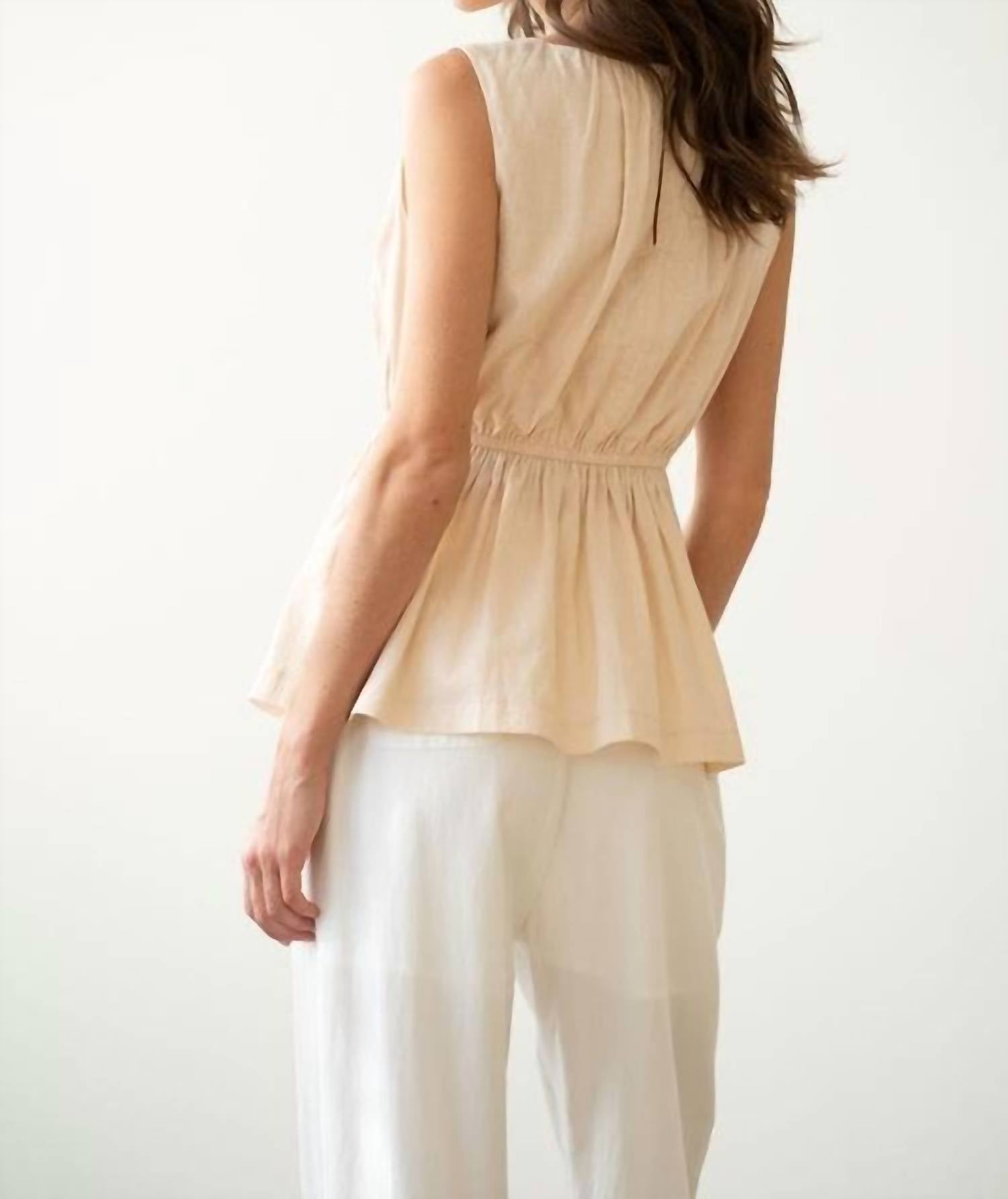 A timeless blouse that will never go out of style. This sleeveless top features a round neckline, under-bust elastic, and a peplum silhouette for a flattering, effortlessly stylish fit. Crafted from a breathable blend of 80% linen and 20% cotton, it combines comfort with chic appeal.