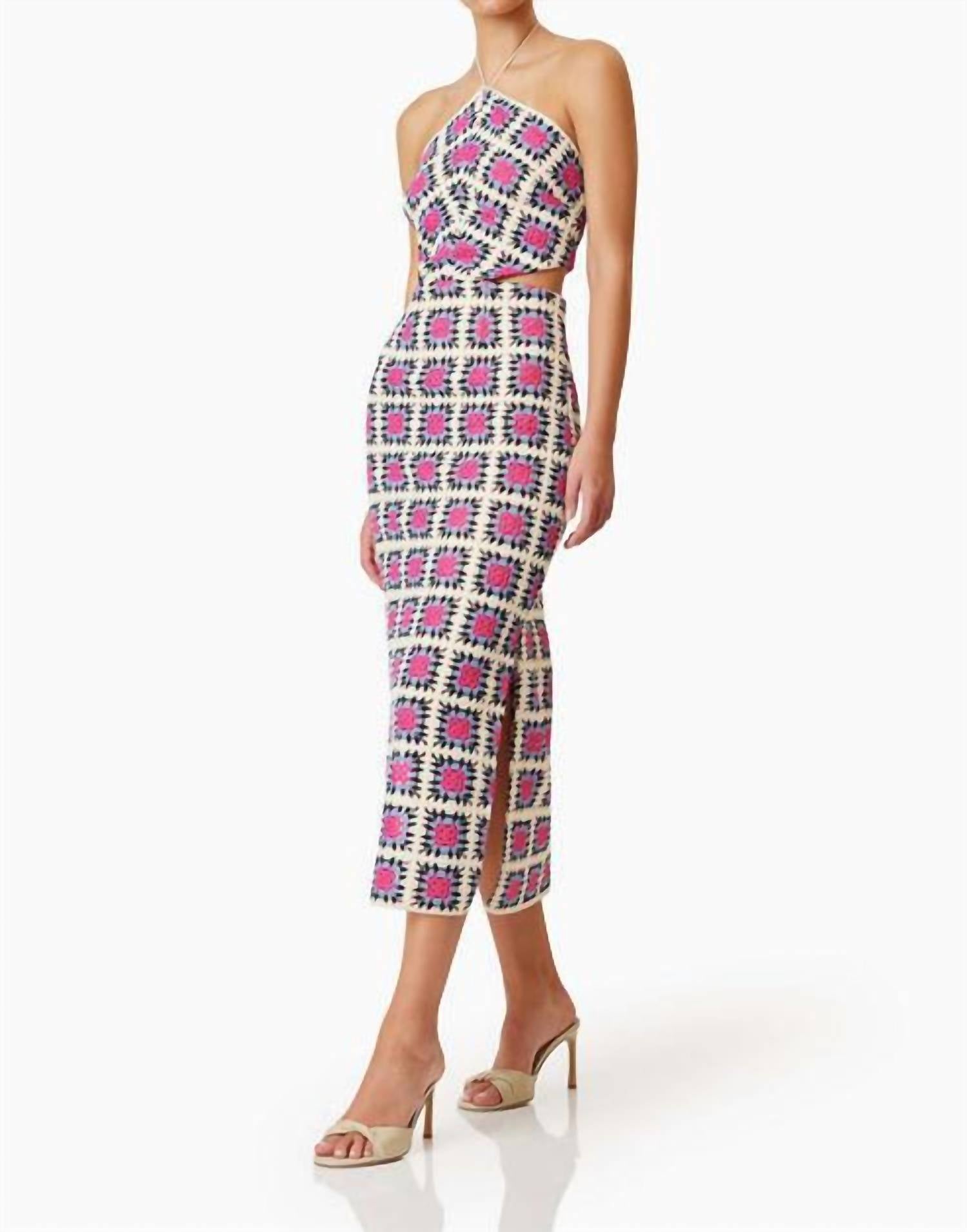 Just add slides or mules and you are good to go. Introducing the Luna Midi Dress by ELLIATT, a striking choice for your holiday party wardrobe. Designed with spaghetti straps, this sheath dress is made from durable polyester and features a zip closure for a secure fit. Its multicolor patterned finish is perfect for a vintage-inspired summer look, with a halter neckline adding a touch of elegance. Ideal for Thanksgiving celebrations, step into style with this effortless party essential.