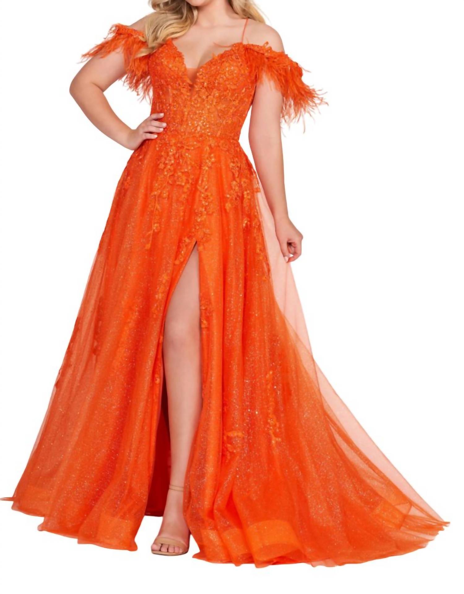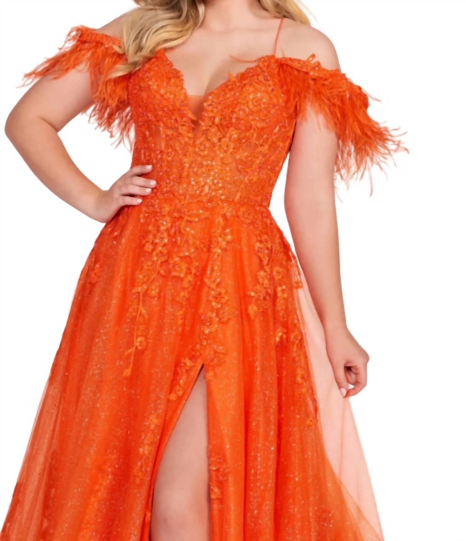 Turn heads in the cutest and most flattering evening dress. Introducing the A-line Prom Dress With Feather Trim by Ellie Wilde, a captivating orange masterpiece perfect for making a statement. Featuring a unique sleeveless design with spaghetti straps, this dress combines embroidered lace applique, feather trim, glitter tulle, and stone accents for an enchanting look. Crafted with a long A-line silhouette and a natural waistline, it boasts a corset back and detachable off-the-shoulder sleeves adorned with feathers, adding a touch of quiet luxury.